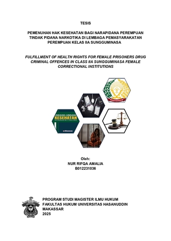 NUR RIFQA AMALIA (B012231036). Pemenuhan Hak Kesehatan Bagi Narapidana Perempuan Tindak Pidana Narkotika Di Lembaga Pemasyarakatan Perempuan Kelas IIA Sungguminasa. Dibimbing oleh Muji Iswanty. Latar Belakang Hak atas kesehatan adalah bagian mendasar dari hak asasi manusia dan merupakan kebutuhan esensial yang tidak dapat dikurangi dalam kondisi apapun. Masalah kesehatan di dalam lembaga pemasyarakatan tidak hanya berdampak pada individu narapidana, tetapi juga memiliki implikasi yang lebih luas terhadap masyarakat. Tujuan penelitian ini untuk menganalisis peran Lembaga Pemasyarakatan Perempuan Kelas IIa Sungguminasa dalam pemenuhan hak kesehatan bagi narapidana perempuan tindak pidana narkotika dan kendala yang dihadapi oleh aparat lembaga pemasyarakatan dalam memberikan pemenuhan hak kesehatan. Metode penelitian empiris dimana jenis dan sumber data yang digunakan dalam penelitian ini yaitu data primer dan data sekunder. Teknik pengumpulan data melalui wawancara dan dokumentasi dimana seluruh datanya dianalisis secara kualitatif dan disajikan secara deskriptif. Hasil penelitian ini menunjukkan bahwa (1) peran Lembaga Pemasyarakatan Perempuan Kelas IIA Sungguminasa dalam pemenuhan hak kesehatan bagi narapidana perempuan tindak pidana narkotika yaitu belum cukup optimal meski upaya pemenuhan hak kesehatan telah dilakukan melalui berbagai program dan kebijakan. Di antaranya adalah penyediaan layanan kesehatan dasar seperti melakukan screening pemeriksaan kesehatan awal pada narapidana yang akan menghuni lembaga pemasyarakatan, pelaksanaan program penyuluhan kesehatan seperti pemberian pemahaman mengenai pentingnya pola hidup sehat, serta kerja sama dengan instansi terkait seperti Dinas Kesehatan dan puskesmas setempat. (2) Dalam pelaksanaannya, faktor yang menjadi kendala yang dihadapi oleh aparat lembaga pemasyarakatan kelas IIA sungguminasa dipengaruhi oleh beberapa faktor yaitu faktor penegak hukum, faktor sarana/prasarana, faktor masyarakat. Kesimpulan peran Lembaga Pemasyarakatan Perempuan Kelas IIa Sungguminasa dalam pemenuhan hak kesehatan telah dilakukan melalui berbagai program dan kebijakan namun dalam pelaksanaannya masih menghadapi beberapa kendala yang dihadapi oleh aparat Lembaga Pemasyarakatan Perempuan Kelas IIa Sungguminasa yang dipengaruhi oleh beberapa faktor yaitu faktor penegak hukum, faktor sarana/prasarana dan faktor Masyarakat.