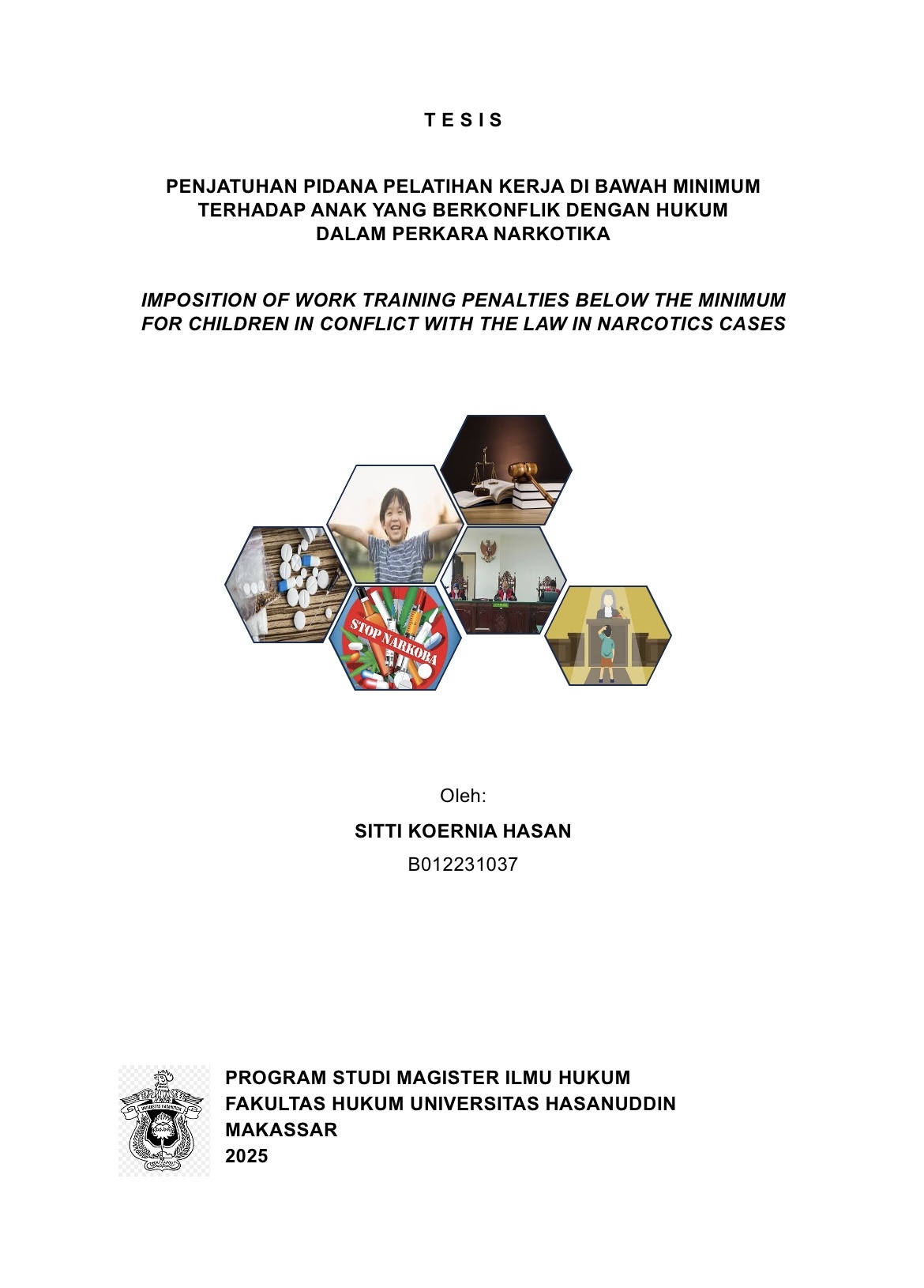 SITTI KOERNIA HASAN (B012231037). Penjatuhan Pidana Pelatihan Kerja Di Bawah Minimum Terhadap Anak Yang Berkonflik Dengan Hukum Dalam Perkara Narkotika. Dibimbing Oleh Haeranah. Latar Belakang: Hakim dalam menjatuhkan pidana pelatihan kerja terhadap anak yang berkonflik dengan hukum dalam perkara narkotika pada Putusan Nomor 32/Pid.Sus-Anak/2024/PN.Mks dan Putusan Nomor 22/Pid.Sus-Anak/2023/PN.Sgm menyimpang dari ketentuan Peraturan Perundang-Undangan. Hakim menjatuhkan pidana pelatihan kerja kepada anak hanya selama 2 (dua) bulan padahal di dalam Undang-Undang Nomor 11 Tahun 2012 Tentang Sistem Peradilan Pidana Anak mengatur bahwa pidana pelatihan kerja dijatuhkan paling singkat 3 (tiga) bulan dan paling lama 1 (satu) tahun. Tujuan: Penelitian ini bertujuan untuk menganalisis pertimbangan hakim dalam menjatuhkan pidana pelatihan kerja di bawah minimum terhadap anak yang berkonflik dengan hukum dalam perkara narkotika serta implikasi hukum penjatuhan pidana pelatihan kerja di bawah minimum terhadap anak yang berkonflik dengan hukum dalam perkara narkotika. Metode: Penelitian ini menggunakan tipe penelitian Normatif-Empiris dengan menggunakan data primer dan data sekunder. Teknik pengumpulan data melalui wawancara dan studi kepustakaan dan dianalisis menggunakan metode analisis deskriptif kualitatif. Hasil: Penelitian menunjukkan bahwa (1) Pertimbangan hakim dalam menjatuhkan pidana pelatihan kerja di bawah minimum terhadap anak yang berkonflik dengan hukum dalam perkara narkotika pada Putusan Nomor 32/Pid.Sus-Anak/2024/PN.Mks dan Putusan Nomor 22/Pid.Sus-Anak/2023/PN.Sgm didasarkan pada kepentingan terbaik anak, pertimbangan Yuridis dan pertimbangan Non-yuridis; (2) Implikasi hukum penjatuhan pidana pelatihan kerja di bawah minimum terhadap anak yang berkonflik dengan hukum dalam perkara narkotika yaitu putusan tersebut batal demi hukum apabila merujuk pada ketentuan Pasal 197 Ayat (1) huruf f dan Ayat (2) KUHAP dan putusan dapat dibatalkan oleh pihak yang berkepentingan melalui upaya hukum karena adanya cacat hukum atau cacat kehendak yang mempengaruhi dasar pertimbangan atau substansi putusan tersebut. Selain itu, implikasi hukum lainnya yang dapat ditimbulkan yaitu tidak adanya kepastian hukum dalam masyarakat serta adanya inkonsistensi dalam putusan penjatuhan pidana. Kesimpulan: Hakim dalam menjatuhkan pidana pelatihan kerja di bawah minimum terhadap anak yang berkonflik dengan hukum dalam perkara narkotika tidak mengikuti ketentuan batas minimum pidana pelatihan kerja yang diatur dalam Peraturan Perundang-Undangan sehingga menimbulkan ketidakpastian hukum dalam masyarakat dan menimbulkan inkonsistensi dalam putusan penjatuhan pidana terhadap anak.