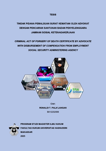 PALA'LANGAN, RONALDI T. (2025) TINDAK PIDANA PEMALSUAN SURAT KEMATIAN OLEH ADVOKAT DENGAN PENCAIRAN SANTUNAN BADAN PENYELENGGARA JAMINAN SOSIAL KETENAGAKERJAAN = CRIMINAL ACT OF FORGERY OF DEATH CERTIFICATE BY ADVOCATE WITH DISBURSEMENT OF COMPENSATION FROM EMPLOYMENT SOCIAL SECURITY ADMINISTERING AGENCY. Thesis thesis, UNIVERSITAS HASANUDDIN MAKASSAR.