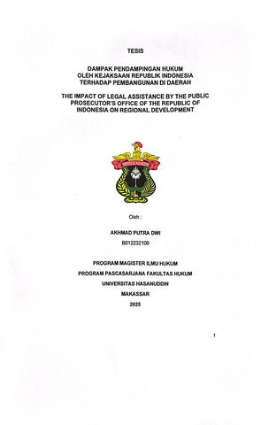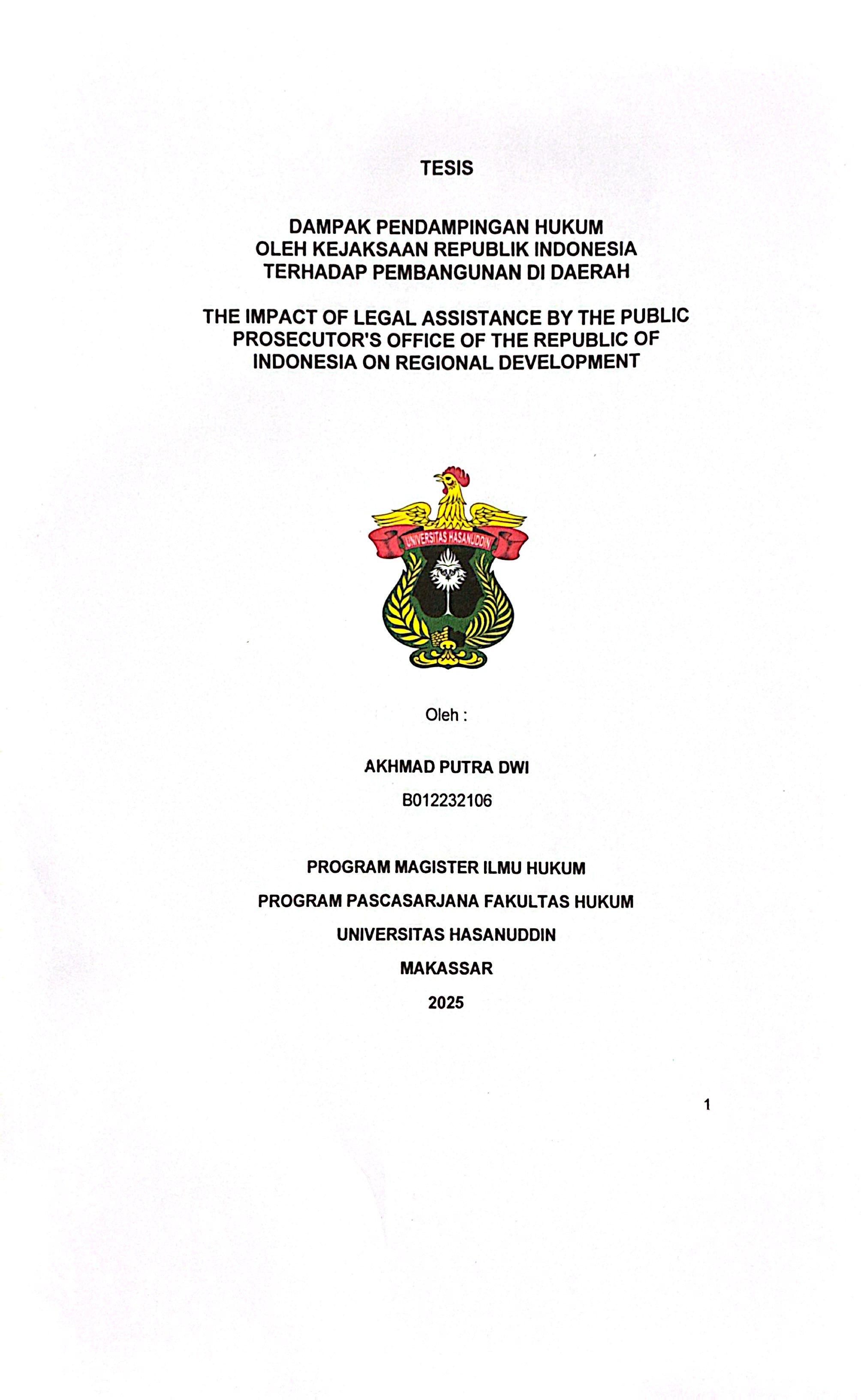 DWI, AKHMAD PUTRA (2025) DAMPAK PENDAMPINGAN HUKUM OLEH KEJAKSAAN REPUBLIK INDONESIA TERHADAP PEMBANGUNAN DI DAERAH = THE IMPACT OF LEGAL ASSISTANCE BY THE PUBLIC PROSECUTOR'S OFFICE OF THE REPUBLIC OF INDONESIA ON REGIONAL DEVELOPMENT. Thesis thesis, UNIVERSITAS HASANUDDIN MAKASSAR.