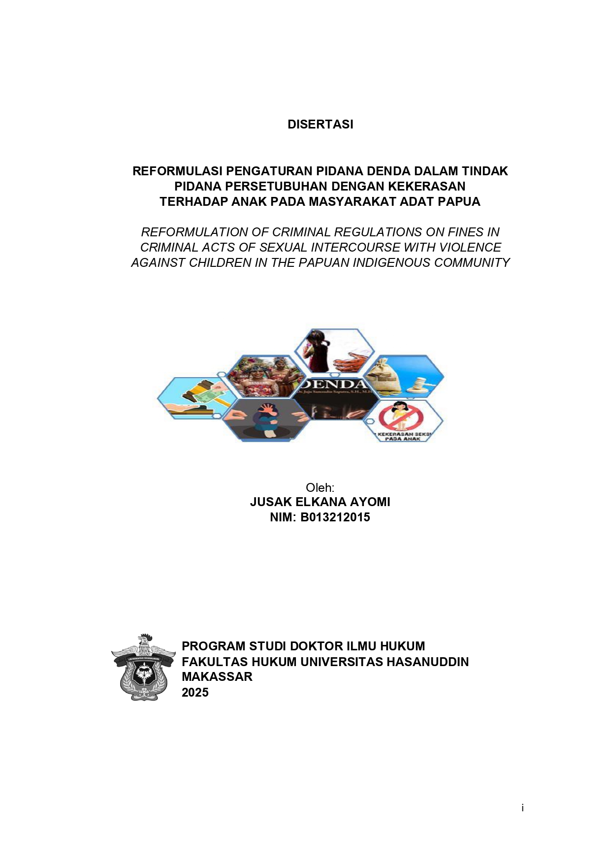 AYOMI, JUSAK ELKANA (2025) REFORMULASI PENGATURAN PIDANA DENDA DALAM TINDAK PIDANA PERSETUBUHAN DENGAN KEKERASAN TERHADAP ANAK PADA MASYARAKAT ADAT PAPUA = REFORMULATION OF CRIMINAL REGULATIONS ON FINES IN CRIMINAL ACTS OF SEXUAL INTERCOURSE WITH VIOLENCE AGAINST CHILDREN IN THE PAPUAN INDIGENOUS COMMUNITY. Disertasi thesis, UNIVERSITAS HASANUDDIN MAKASSAR.