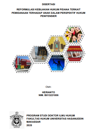 Herianto (B013221006). REFORMULASI KEBIJAKAN HUKUM PIDANA TERKAIT PEMIDANAAN TERHADAP ANAK DALAM PERSPEKTIF HUKUM PENITENSIER. Dibimbing oleh Amir Ilyas selaku Promotor, Muhammad Said Karim dan Haeranah selaku Co-Promotor. Penelitian ini betujuan untuk mengkaji dan menemukan bentuk perlindungan hukum bagi anak yang berkonflik dengan hukum dalam perspektif hukum penitensier, konsep pemidanaan terhadap anak sebagai pelaku tindak pidana di Indonesia dan reformulasi pemidanaan terhadap anak dalam perspektif hukum penitenser yang ideal setelah terbitnya Kitab Undang-Undang Hukum Pidana teribaru. Penelitian ini menggunakan penelitian hukum normatif, dengan pendekatan perundang-undangan dan pendekatan konseptual. Bahan hukumnya bersumber dari bahan hukum primer dan sekunder. Teknik pengumpulan bahan hukumnya melalui studi kepustakaan dan wawancara. Bahan hukum dianalisis menggunakan metode kualitatif. Hasil penelitian ini menunjukan bahwa: (1) pada anak itu melekat beberapa prinsip dasar, diantaranya yaitu prinsip nondiskriminasi, prinsip kepentingan terbaik bagi anak, dan prinsip hak hidup, kelangsungan hidup dan perkembangan anak. Ketiga prinsip tersebut menjadi bentuk perlindungan hukum bagi anak ketika terlibat dengan hukum; (2) Sistem peradilan pidana anak atau diversi telah diterapkan di berbagai negara dengan karateristik yang berbeda-beda. hukum internasional telah mengakui bahwa terhadap anak harus diperlakukan berbeda dengan orang dewasa. Di Indonesia, berlaku sistem peradilan pidana anak yang mengacu pada Undang-Undang Nomor 11 Tahun 2012. Hanya saja, banyaknya kasus anak yang diputus pidana penjara menunjukan bahwa diversi belum terimplementasi maksimal di Indonesia. Penyebabnya mulai dari kemampuan aparat penegak hukum yang belum memadai, korban dan/atau keluarga korban yang menolak damai, syarat diversi yang membatasi upaya diversi, dll. (3) Reformulasi pemidanaan anak dalam Undang-Undang Sistem Peradilan Pidana Anak perlu dilakukan antara lain dengan mengubah syarat diversi dalam Undang-Undang Nomor 11 Tahun 2012, menetapkan sanksi tindakan sebagai primum remedium dan menetapkan tata cara dan jumlah kerugian korban.