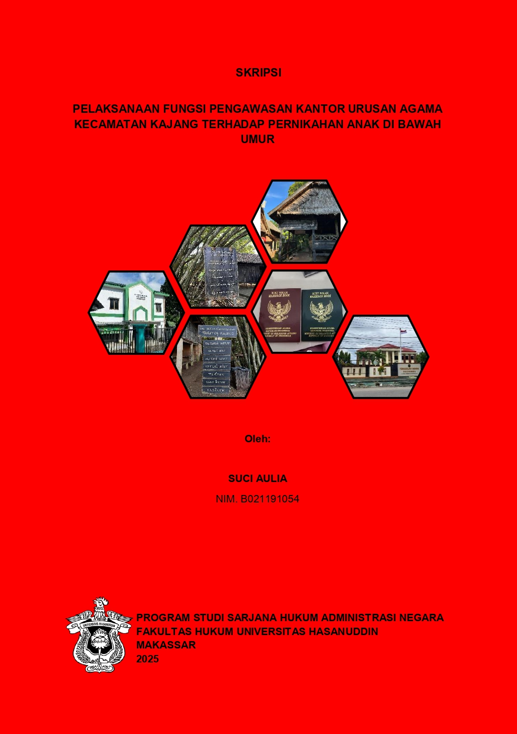 SUCI AULIA (B021191054) dengan judul Pelaksanaan Fungsi Pengawasan Kantor Urusan Agama Kecamatan Kajang Terhadap Pernikahan Anak di Bawah Umur, yang dibimbing oleh Andi Syahwiah A. Sapiddin sebagai pembimbing utama dan Eka Merdekawati Djafar sebagai pembimbing pendamping. Latar Belakang: pada beberapa kasus pernikahan siri, persyaratan yang paling sulit untuk dipenuhi yaitu usia minimal menikah sehingga beberapa pasangan lebih memilih menikah secara siri. Oleh sebab itu, dibutuhkan pengawasan pernikahan anak di bawah umur. Tujuan: penelitian ini yaitu untuk mengetahui pelaksanaan fungsi pengawasan Kantor Urusan Agama Kecamatan Kajang terhadap pernikahan anak di bawah umur, serta apa saja faktor-faktor yang mempengaruhi pelaksanaan pengawasan Kantor Urusan Agama Kecamatan Kajang terhadap pernikahan anak di bawah umur. Metode: penelitian yang penulis gunakan yaitu metode penelitian hukum empiris dengan berupaya melihat hukum dalam arti nyata dan meneliti bagaimana hukum tersebut berlaku di masyarakat. penelitian ini menggunakan data-data yang ada di lapangan sebagai sumber utama seperti hasil wawancara dan observasi lapangan. hasil: penelitian ini menjelaskan pelaksanaan fungsi pengawasan KUA Kecamatan Kajang yang terfokus pada pengawasan administratif calon, baik yang masih di bawah umur maupun yang telah cukup umur. Kesimpulan: Pengawasan KUA Kecamatan Kajang dilihat dari segi waktu pelaksanaan tergolong ke dalam pengawasan preventif, yang dimaksud berupa pengawasan administratif yang hanya berfokus pada berkas yang harus dilengkapi oleh pasangan yang akan melangsungkan pernikahan. faktor yang mempengaruhi ketidakoptimalan pengawasan KUA Kecamatan Kajang disebabkan oleh: faktor hukum; faktor sarana; faktor masyarakat; serta faktor kebudayaan.