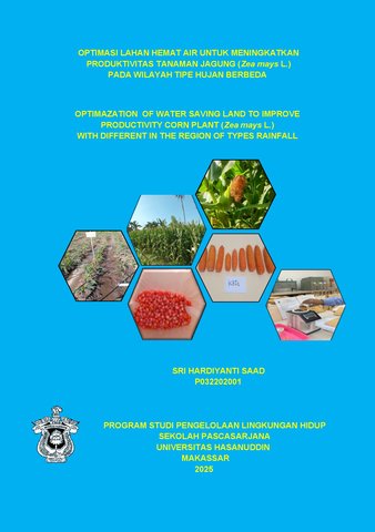 SRI HARDIYANTI SAAD. Optimasi Lahan Hemat Air Untuk Meningkatkan Produktivitas Tanaman Jagung (Zea mays L.) Pada Wilayah Hujan Berbeda (dibimbing oleh Abd.Haris B dan Amir Yassi) Latar Belakang. Jagung (Zea mays L.) adalah komoditas strategis dengan permintaan tinggi yang produktivitasnya dipengaruhi oleh kondisi tanah, iklim, dan tanaman, karena air menjadi faktor krusial bagi pertumbuhan optimal, diperlukan sistem irigasi efisien dan terjangkau, khususnya di daerah minim pasokan air, guna mengoptimalkan pemanfaatan lahan.Tujuan.Penelitian ini bertujuan untuk (1) Menganalisis pengaruh interaksi tingkat pemberian air dan interval waktu penyiraman terbaik terhadap pertumbuhan dan hasil produksi tanaman jagung, (2) Memperoleh tanaman jagung yang memiliki pertumbuhan dan produksi yang terbaik berdasarkan pengaruh perlakuan kapasita lapang pemberian air, (3) Mengetahui interval waktu penyiraman yang memberikan pertumbuhan dan produksi terbaik pada tanaman jagung. Metode. Penelitian dilaksanakan pada Juni–Oktober 2024 di Dusun Boronguntia, Kabupaten Gowa, dan Kelurahan Talotenreng, Kabupaten Wajo, dalam bentuk percobaan faktorial dua faktor yang disusun berdasarkan rancangan Petak Petak-Petak terpisah (RPPT) dengan tiga tingkat kapasitas lapang (100%, 75%, 50%) dan empat interval penyiraman (1, 2, 3, 4 hari). Analisis. Hasil pengamatan dan pengukuran yang diperoleh pada penelitian dianalisis menggunakan analisis sidik ragam. Apabila perlakuan menunjukkan pengaruh nyata maka dilakukan uji lanjt BNT (Beda Nyata Terkecil pada taraf α = 0.05). Hasil. Hasil penelitian menunjukkan (1) Kombinasi perlakuan kapasitas lapang dan interval waktu penyiraman menunjukkan pengaruh sangat signifikan terhadap tinggi tanaman, jumlah daun, bobot 100 biji, (2) Pengaruh perlakuan kapasitas lapang memberikan hasil berpengaruh sangat nyata terhadap parameter umur berbunga betina, umur berbunga jantan dan Anthesis Silking Interval (ASI), bobot 100 biji, jumlah biji per tongkol, rendemen berpengaruh nyata.(3) Hasil penelitian menunjukkan bahwa perlakuan interval waktu penyiraman berpengaruh sangat nyata terhadap bobot 100 biji dan produksi , sedangkan parameter bobot segar akar dan panjang akar berpengaruh nyata. Kesimpulan. Kombinasi kapasitas lapang 75% dengan interval penyiraman 3–4 hari terbukti menghasilkan produksi jagung tertinggi hingga 6,88 ton/ha, dengan efisiensi penggunaan air lebih baik dibanding kapasitas lapang 100%. Temuan baru ini memperkuat konsep pengelolaan air berbasis interval penyiraman sebagai metode adaptasi perubahan iklim di lahan kering. Disarankan penerapan teknik ini pada budidaya jagung di lahan tadah hujan atau kering untuk menjaga produktivitas dan menghemat air.