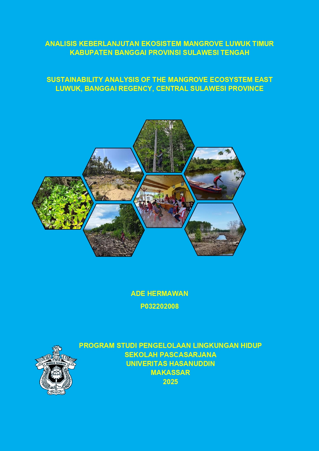 ADE HERMAWAN. Analisis Keberlanjutan Ekosistem Mangrove Luwuk Timur Kabupaten Banggai Provinsi Sulawesi Tengah (dibimbing oleh Muhammad Rijal Idrus dan Ambo Tuwo) Latar belakang. Ekosistem Mangrove merupakan salah satu ekosistem pesisir yang berperan penting dalam menjaga keseimbangan lingkungan, mendukung keanekaragaman hayati, serta menopang kehidupan sosial dan ekonomi masyarakat pesisir. Namun ekosistem mangrove luwuk timur mengalami tekanan dari aktivitas manusia berupa alih fungsi lahan untuk tambak, pertanian, pemukiman serta penebangan liar. Tujuan. Penelitian ini bertujuan untuk (1) Menganalisis kondisi dan potensi ekosistem mangrove luwuk timur, (2) Menganalisis nilai keberlanjutan ekosistem mangrove luwuk timur, (3) Merumuskan strategi keberlanjutan ekosistem mangrove luwuk timur. Metode. Pengumpulan vegetasi mangrove dan survei sosial-ekonomi, penilaian status keberlanjutan dilakukan menggunakan pendekatan analisis Multi- Dimensional Scaling (MDS) dengan Rap-Mfrast (Rapid Appraisal for Mangrove Forest Sustainability). Analisis leverage untuk mengidentifikasi atribut-atribut sensitif serta analisis SWOT untuk merumuskan strategi pengelolaan ekosistem mangrove luwuk timur. Hasil penelitian menunjukkan (1) identifikasi mangrove pada 5 stasiun ditemukan 12 spesies dari 7 famili, dengan dominansi famili Rhizophoraceae. (2) nilai indeks keberlanjutan Multidimensi 55,49 dikategorikan cukup berkelanjutan, dimensi ekologi 71,29 cukup berkelanjutan, dimensi ekonomi 50,46 cukup berkelanjutan, dimensi sosial 47,37 kurang berkelanjutan dan dimensi kelembagaan 51,86 cukup berkelanjutan. Hasil analisis leverage menunjukan terdapat 13 dari 29 atribut pengungkit yang pengaruhnya sensitif terhadap keberlanjutan ekosistem mangrove luwuk timur, (3) strategi utama dalam pengelolan ekosistem mangrove luwuk timur adalah pengembangan ekowisata mangrove berbasis kawasan konservasi dan pengembangan program rehabilitasi partisipatif terintegrasi. Kesimpulan. Ekosistem mangrove luwuk timur memiliki keanekaragaman jenis dan secara ekologis masih potensial namun memerlukan perlindungan dan pengelolaan berbasis zonasi. Analisis Rap- Mfrast menunjukkan status cukup berkelanjutan, meskipun dimensi sosial perlu ditingkatkan. Pengembangan kawasan ekowisata mangrove dan rehabilitasi terintegrasi adalah prioritas utama.