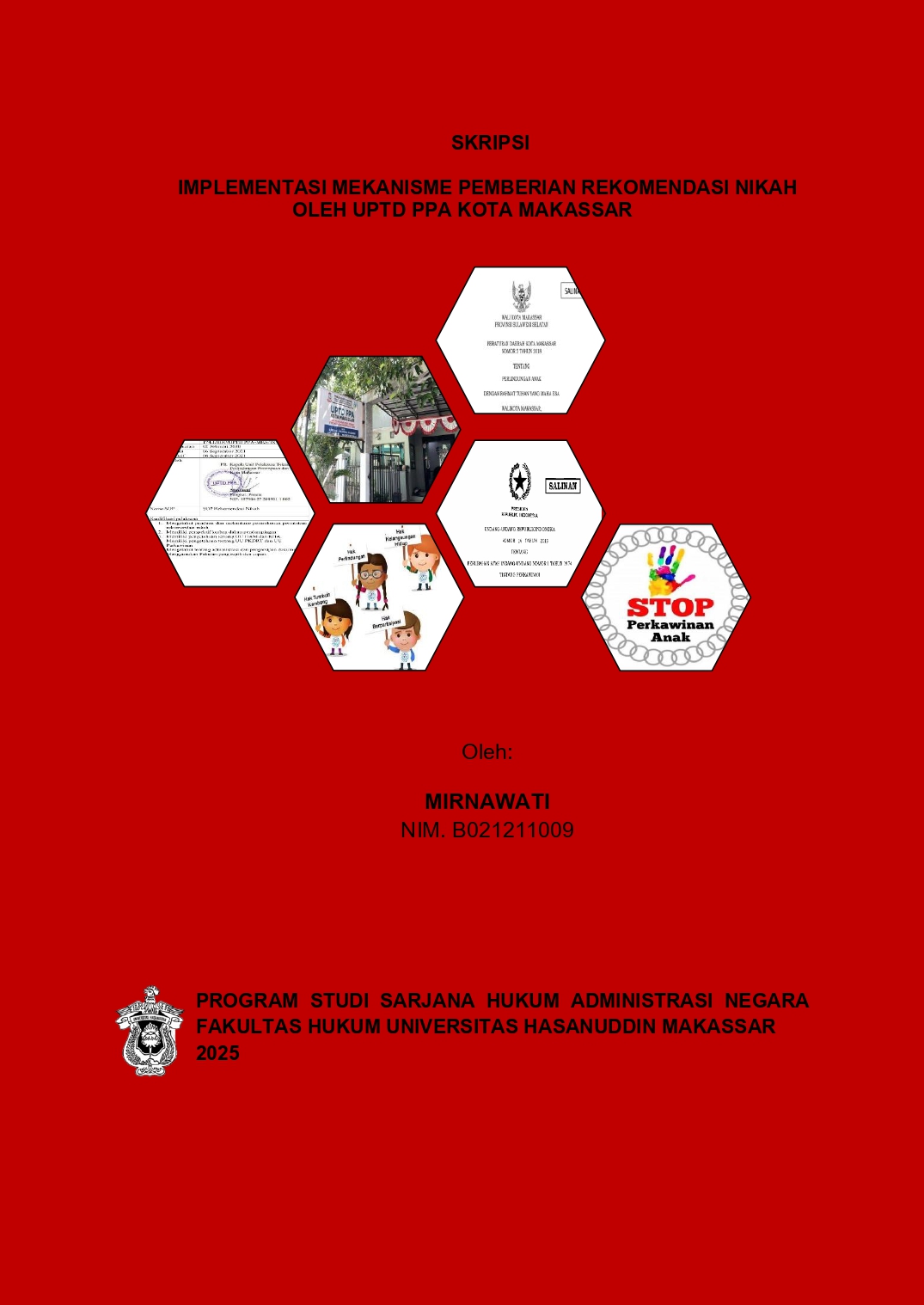MIRNAWATI (B021211009). Implementasi Mekanisme Pemberian Rekomendasi Nikah Oleh UPTD PPA Kota Makassar. Dibimbing oleh Eka Merdekawati Djafar sebagai pembimbing. Latar Belakang: Di Kota Makassar, praktik perkawinan anak masih tinggi dengan ribuan kasus tercatat setiap tahun, meskipun telah ada regulasi yang mengatur untuk mengatasi hal ini, UPTD PPA Kota Makassar memberikan layanan rekomendasi nikah bagi anak di bawah umur, terutama yang hamil di luar nikah. Namun, masih ditemukan pemberian rekomendasi yang kurang tepat, sehingga mekanisme pemberian rekomendasi perlu dianalisis. Tujuan: Penelitian ini bertujuan untuk mengetahui mekanisme pemberian rekomendasi nikah oleh UPTD PPA Kota Makassar dan faktor faktor yang mempengaruhi pemberian rekomendasi nikah. Metode: Metode penelitian yang digunakan adalah penelitian hukum empiris dengan menggunakan sumber data primer melalui wawancara, observasi dan dokumentasi serta sumber data sekunder dari berbagai literatur ilmiah. Data tersebut dikumpulkan melalui teknik penelitian lapangan dan teknik penelitian kepustakaan lalu dianalisis secara deskriptif kualitatif. Hasil: Penelitian menunjukkan bahwa (1) pelaksanaan Home Visit (kunjungan ke rumah) tidak konsisten dan jarang dilakukan pada kasus rekomendasi nikah, kurangnya konsistensi verifikasi kasus sesuai SOP, dan tidak adanya pencatatan rekapitulasi klasifikasi kasus yang mendapatkan rekomendasi nikah maupun yang tidak mendapatkan rekomendasi nikah. (2) Faktor-faktor yang menjadi hambatan dalam implementasi pemberian rekomendasi nikah yaitu, faktor budaya, faktor sarana dan fasilitas, faktor masyarakat, dan faktor penegak hukum. Kesimpulan: Bahwa Implementasi mekanisme pemberian rekomendasi nikah oleh UPTD PPA Kota Makassar belum efektif karena masih terdapat hambatan yang bersifat struktural maupun kultural.