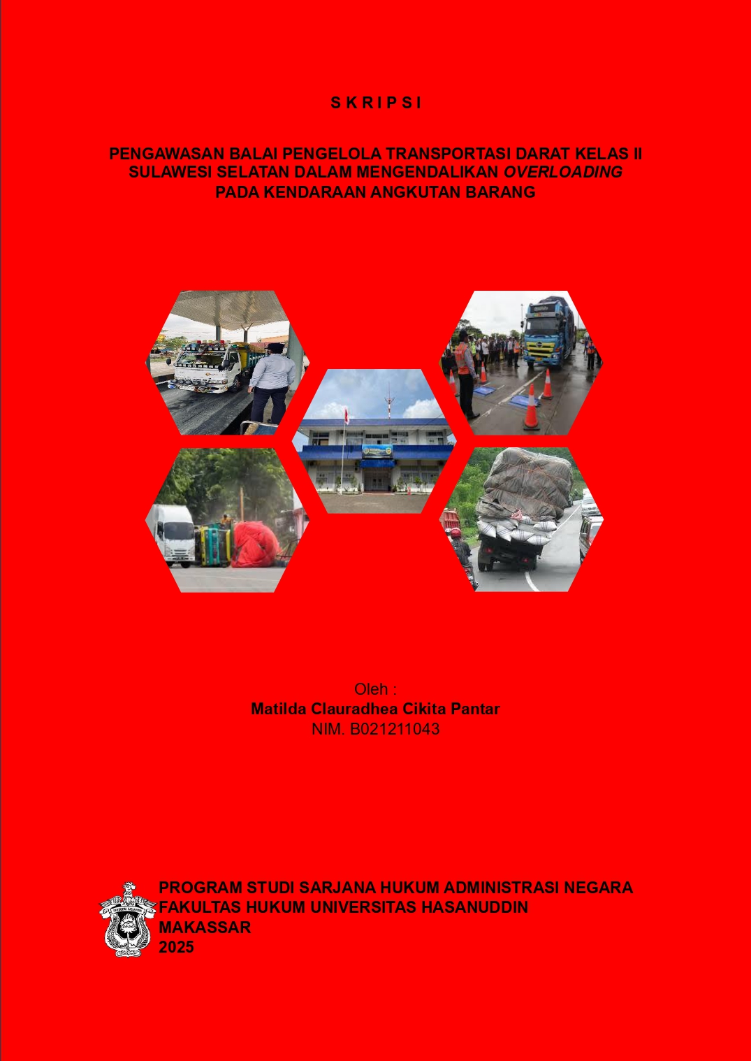 MATILDA CLAURADHEA CIKITA PANTAR (B021211043). Pengawasan Balai Pengelola Transportasi Darat Kelas II Sulawesi Selatan Dalam Mengendalikan Overloading Pada Kendaraan Angkutan Barang. Dibimbing oleh Ibu Eka Merdekawati Djafar sebagai Pembimbing. Latar Belakang : Overloading pada kendaraan angkutan barang merupakan salah satu penyebab utama kerusakan infrastruktur jalan dan meningkatnya angka kecelakaan lalu lintas di Sulawesi Selatan. Balai Pengelola Transportasi Darat Kelas II Sulawesi Selatan memiliki peran dalam mengawasi dan mengendalikan praktik overloading. Tujuan : Penelitian ini bertujuan untuk menganalisis pelaksanaan pengawasan oleh Balai Pengelola Transportasi Darat Kelas II Sulawesi Selatan dalam mengendalikan overloading pada kendaraan angkutan barang guna meningkatkan kemampuan dan penerapan kebijakan pengawasan yang efektif. Metode : Tipe penelitian yang digunakan adalah penelitian hukum empiris dengan pendekatan kualitatif, dengan menggunakan sumber data dari hasil wawancara, observasi, dan hasil kepustakaan lalu dianalisis secara analisis data kualitatif. Hasil : Penelitian menunjukkan bahwa (1) Pelaksanaan pengawasan terhadap pengemudi angkutan barang tidak berjalan efektif karena masih terdapat beberapa faktor penghambat. (2) Penerapan sanksi yang diterapkan masih dianggap belum cukup memberikan efek jera yang signifikan bagi pelanggar. Kesimpulan : penerapan sanksi terhadap pengemudi yang melakukan overloading pada kendaraan angkutan barang telah berjalan sesuai dengan peraturan yang berlaku. Namun, efektifitas sanksi ini masih perlu ditingkatkan melalui pengawasan yang lebih ketat bagi pengemudi agar pelanggaran overloading dapat diminimalisir secara berkelanjutan.