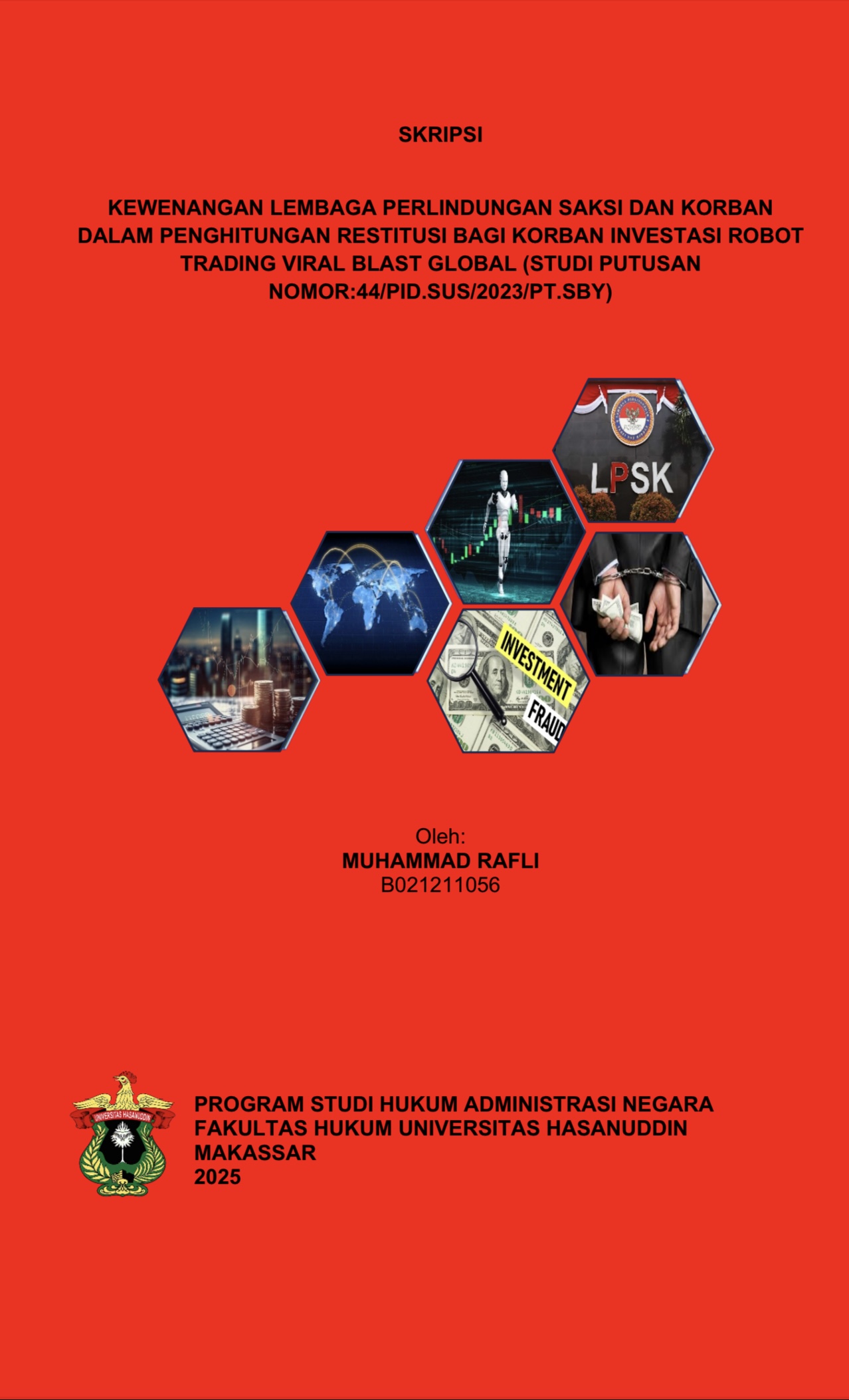 RAFLI, MUHAMMAD (2025) KEWENANGAN LEMBAGA PERLINDUNGAN SAKSI DAN KORBAN DALAM PENGHITUNGAN RESTITUSI BAGI KORBAN INVESTASI ROBOT TRADING VIRAL BLAST GLOBAL (STUDI PUTUSAN NOMOR:44/PID.SUS/2023/PT.SBY) = THE AUTHORITY OF THE WITNESS AND VICTIM PROTECTION AGENCY IN CALCULATION OF RESTITUTION FOR VICTIMS OF THE GLOBAL VIRAL TRADING BLAST ROBOT INVESTMENT (DECISION STUDY NUMBER: 44/PID.SUS/2023/PT.SBY). Skripsi thesis, UNIVERSITAS HASANUDDIN.