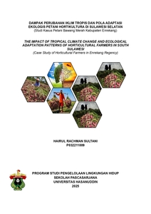 ABSTRAK Hairul Rachman Sultani. Dampak Perubahan Iklim Tropis Dan Pola Adaptasi Ekologis Petani Hortikultura Di Sulawesi Selatan (Studi Kasus Petani Bawang Merah Kabupaten Enrekang). (dibimbing oleh Eymal Bahsar Demmalino dan Amir Yassi) Perubahan iklim global, regional, dan lokal berbeda secara fenomenologis dan dampaknya pun di sektor pertanian hortikultura serta pola adaptasi ekologis petani dalam merespon fenomena perubahan iklim juga diduga berbeda. Penelitian ini bertujuan untuk mengkaji perubahan iklim tropis di Sulawesi Selatan dan menganalisis dampaknya pada pertanian bawang merah di Kabupaten Enrekang. Lebih jauh akan dinanalisis bagaimana pola adaptasi ekologis petani bawang merah dalam merespon fenomena dampak perubahan iklim tropis yang dimaksud. Penelitian ini menggunakan kerangka penafsiran postpositivistik tradisi studi kasus. Dimulai dengan penetapan lokasi penelitian secara purposive sampling, penetapan instrument penelitian, penentuan jenis dan sumber data, penentuan informan kunci (secara snowballing) dan dilanjutkan dengan pemgumpulan data dengan menggunakan teknik pengumpulan data secara komprehensif (observasi, indepth interview, dokumentasi dan triangulasi) dan analisis data dengan menggunakan teknik analisis data secara terintegrasi (data collection, data reduction, data display, dan conclusion). Penelitian ini diakhiri dengan uji keabsahan data berupa uji credibility dan uji reliability. Hasil penelitian menunjukan bahwa Fenomena Perubahan Iklim Tropis di Kabupaten Enrekang khususnya dalam satu dekade terakhir menunjukkan terjadinya kenaikan suhu rata-rata. Ditemukan suhu maksimum, minimum, dan rata-rata terus mengalami peningkatan meskipun dengan pola yang fluktuatif. Perubahan iklim di Sulawesi Selatan selain berpengaruh terhadap kenaikan suhu juga berpengaruh terhadap curah hujan yang bervariasi setiap tahun dan dapat berubah dengan cepat. Perubahan iklim berdampak signifikan pada produksi, luas tanam, dan produktivitas bawang merah di Enrekang, namun adaptasi petani melalui teknologi dan praktik budidaya efektif mampu menjaga tren kenaikan produksi dan stabilitas produktivitas. Strategi adaptasi yang dilakukan oleh petani khususnya petani bawang merah di Kabupaten Enrekang meliputi pemupukan dan pengendalian hama, pergiliran tanaman, pemanfaatan varietas tanaman tahan kekeringan dan hama, pengembangan teknologi pemompaan dan pendekatan berdasarkan pengetahuan lokal