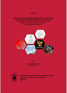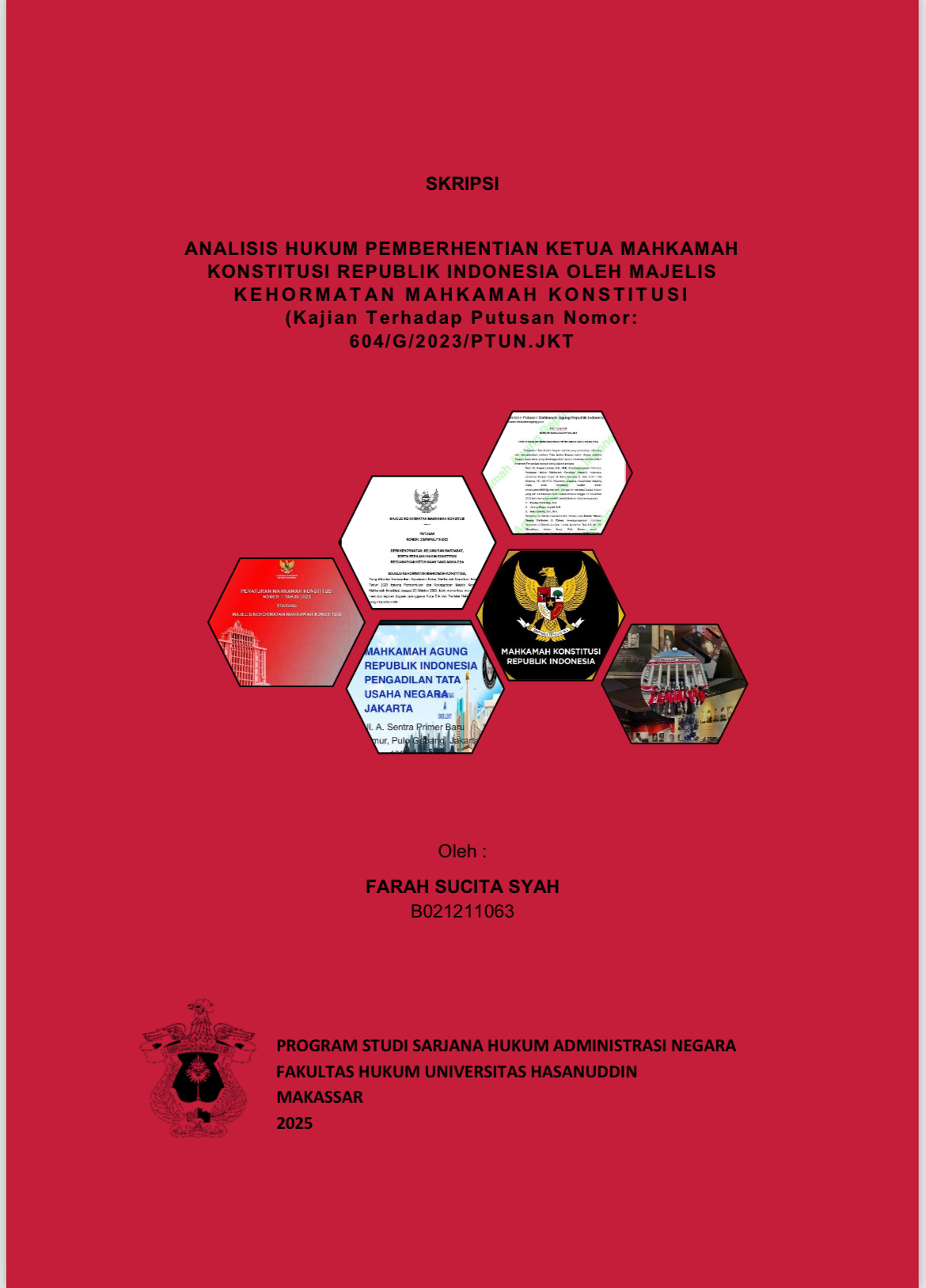 SYAH, FARAH SUCITA (2025) Analisis Hukum Pemberhentian Ketua Mahkamah Konstitusi oleh Majelis Kehormatan Mahkamah Konstitusi (Kajian Terhadap Putusan Nomor: 604/G/2023/PTUN.JKT) = Legal Analysis Of The Dismissal Of The Chief Justice Of The Constitutional Court By The Honorary Council Of The Constitutional Court (Study Of The Decision Number: 604/G/2023/PTUN.JKT). Skripsi thesis, UNIVERSITAS HASANUDDIN MAKASSAR.