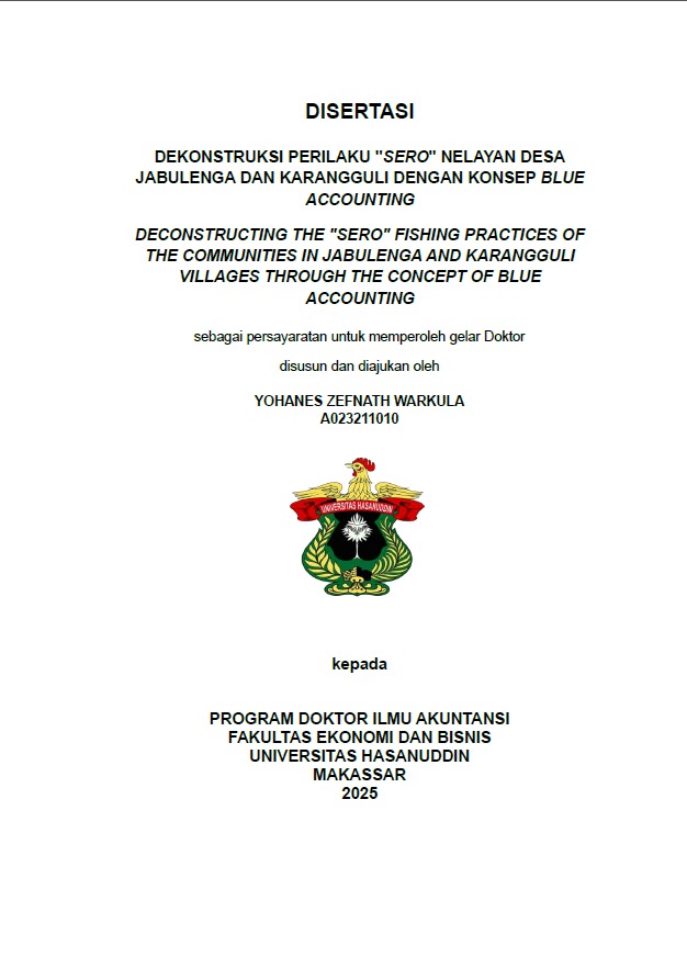 YOHANES ZEFNATH WARKULA. Dekonstruksi Perilaku Sero Nelayan Desa Jabulenga dan Karangguli Dengan Konsep Blue Accounting (dibimbing oleh Mediaty dan (Almh. Ratna Ayu Damayanti) Arifuddin). Latar belakang. Penelitian tentang blue accounting menyoroti pentingnya keberlanjutan lingkungan laut, dengan penekanan pada pengelolaan aktivitas manusia dan bisnis yang ramah lingkungan. Metode penangkapan ikan sistem sero berpotensi membuat masyarakat terjebak dalam eksploitasi berlebihan sumber daya laut, di mana sumber daya tersebut diperlakukan sebagai komoditas yang harus dimaksimalkan produksinya tanpa mempertimbangkan dampak lingkungan. Tujuan. Penelitian ini bertujuan untuk dekonstruksi perilaku “sero” nelayan Desa Jabulenga dan Desa Karangguli dengan konsep blue accounting. Metode. Penelitian ini menggunakan paradigma postmodernisme ala Derrida dengan tujuh langkah-langkah dalam penelitian 1) pemilihan teks, 2) membaca awal, 3) identifikasi binner opposition, 4) analisis ketidak pastian dalam makna, 5) pertimbangan konteks sejarah dan budaya, 6) membangun argumen alternatif, dan 7) refleksi tentang proses penelitian. Hasil. Melalui dekonstruksi pola pikir ini, blue accounting menjadi jembatan untuk membangun kesadaran kolektif mengenai dampak jangka panjang dari praktik penangkapan ikan yang tidak ramah lingkungan. berfokus pada protagonisme masyarakat pesisir sebagai agen perubahan, yang tidak hanya diposisikan sebagai korban dampak lingkungan tetapi juga sebagai pembuat keputusan aktif dalam pengelolaan sumber daya mereka. Blue accounting bukan hanya sekedar alat analisis, tetapi juga merupakan instrumen yang menggerakkan masyarakat menuju praktik berkelanjutan. Kesimpulan. Penelitian ini menunjukkan bahwa dekontruksi perilaku nelayan melalui penerapan konsep blue accounting di Desa Jabulenga dan Desa Karangguli berfungsi lebih dari sekadar kerangka evaluasi dan menilai dampak lingkungan dari praktik penangkapan ikan. Penerapan konsep ini juga memainkan peran penting dalam membongkar dan merubah perilaku tradisional nelayan yang telah terikat pada sistem sero.