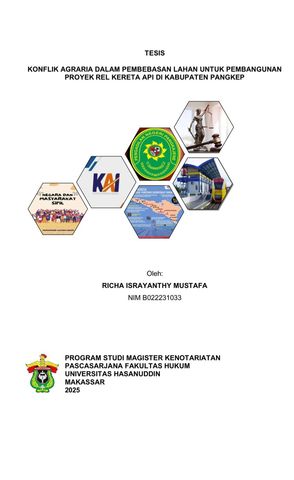 RICHA ISRAYANTHY MUSTAFA (B022231033), Dengan Judul “ Konflik Agraria Dalam Pembebasan Lahan Untuk Pembangunan Proyek Rel Kereta Api di Kabupaten Pangkep” (dibimbing Oleh Andi Suriyaman Mustari Pide) Latar Belakang: Dalam rangka mendorong percepatan pembangunan infrastruktur, pemerintah menetapkan proyek strategis nasional (PSN), termasuk pembangunan rel kereta api Makassar-Parepare. Pengadaan tanah untuk PSN telah diatur dalam Undang-Undang Nomor 2 Tahun 2012 beserta peraturan pelaksananya. Namun, pelaksanaan kebijakan tersebut di lapangan, khususnya di Kabupaten Pangkep, kerap menghadapi berbagai tantangan yang menimbulkan konflik agraria. Tujuan: Penelitian ini bertujuan untuk menganalisis konsistensi pengaturan pengadaan tanah untuk proyek strategis nasional dengan implementasinya di lapangan serta mengidentifikasi faktor-faktor yang memengaruhi terjadinya konflik agraria dalam pembangunan rel kereta api di Kabupaten Pangkep. Metode: Penelitian ini menggunakan metode hukum empiris dengan pendekatan kualitatif deskriptif. Data diperoleh melalui studi kepustakaan terhadap peraturan perundang-undangan yang relevan dan studi lapangan melalui wawancara dengan praktisi hukum, tokoh masyarakat, serta pihak pemerintah terkait. Analisis dilakukan untuk menilai efektivitas pelaksanaan regulasi dan mengungkap akar penyebab konflik yang terjadi. Hasil: Hasil penelitian menunjukkan bahwa implementasi pengadaan tanah di Kabupaten Pangkep belum sepenuhnya konsisten dengan ketentuan hukum yang berlaku. Konsultasi publik dan musyawarah ganti rugi sering dilakukan secara formalistik dan minim partisipasi masyarakat, sementara konsep “kepentingan umum” cenderung diinterpretasikan sepihak oleh pemerintah. Konflik agraria dalam proyek ini juga dipengaruhi oleh lemahnya koordinasi antar lembaga, minimnya pengawasan, kesenjangan antara norma dan praktik hukum, serta kondisi sosial-ekonomi masyarakat yang bergantung pada tanah dan memiliki keterbatasan informasi. Kesimpulan: Ketidakkonsistenan antara aturan dan praktik dalam pengadaan tanah untuk proyek strategis nasional berpotensi menimbulkan konflik agraria. Untuk itu, diperlukan penguatan kelembagaan, pengawasan yang ketat, serta peningkatan pemahaman hukum bagi para pelaku agar pelaksanaan regulasi dapat berjalan secara efektif dalam mendukung pembangunan berkelanjutan dan tertib tata ruang.