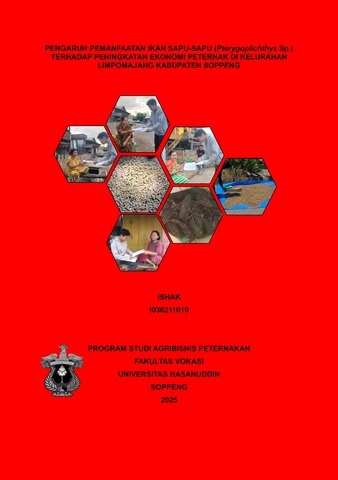 ISHAK. Pengaruh Pemanfaatan Ikan Sapu-Sapu (Pterygoplichthys Sp.) Terhadap Peningkatan Ekonomi Peternak Di Kelurahan Limpomajang Kabupaten Soppeng (dibimbing oleh Sri Wira Utami, S.Pt., M.Si.). Latar belakang. Ikan sapu-sapu merupakan spesies invasif yang merusak ekosistem dan kurang bernilai ekonomis. Pendekatan baru melalui pemanfaatannya sebagai bahan pakan ternak menunjukkan potensi untuk meningkatkan pendapatan peternak, khususnya di Kelurahan Limpomajang. Tujuan. Penelitian ini bertujuan mengkaji pengaruh pemanfaatan ikan sapu-sapu terhadap peningkatan ekonomi peternak. Metode. Penelitian dilakukan dengan pendekatan kuantitatif melalui survei terhadap 33 peternak yang mengikuti program kadereka pada tahun2024 yang memanfaatkan ikan sapu-sapu sebagai pakan ternak. Data dikumpulkan dengan kuesioner dan dokumentasi, kemudian dianalisis menggunakan regresi linear sederhana. Hasil. Penggunaan ikan sapu-sapu sebagai pakan ternak memberikan pengaruh signifikan terhadap peningkatan ekonomi peternak (R² = 0,741 < 0,001). Pemanfaatan ini terbukti meningkatkan pendapatan (86,66%), produktivitas ternak (85,45%), serta keberlanjutan usaha (75,15%). Meskipun demikian, penurunan biaya operasional belum signifikan (30,30%). Akses terhadap bahan baku yang mudah (93,33%) dan kemudahan pengolahan (89,09%) mendukung adopsi teknologi ini secara luas. Kesimpulan. Pemanfaatan ikan sapu-sapu sebagai pakan ternak meningkatkan pendapatan dan produktivitas peternak, serta mendukung pengelolaan sumber daya lokal secara berkelanjutan.