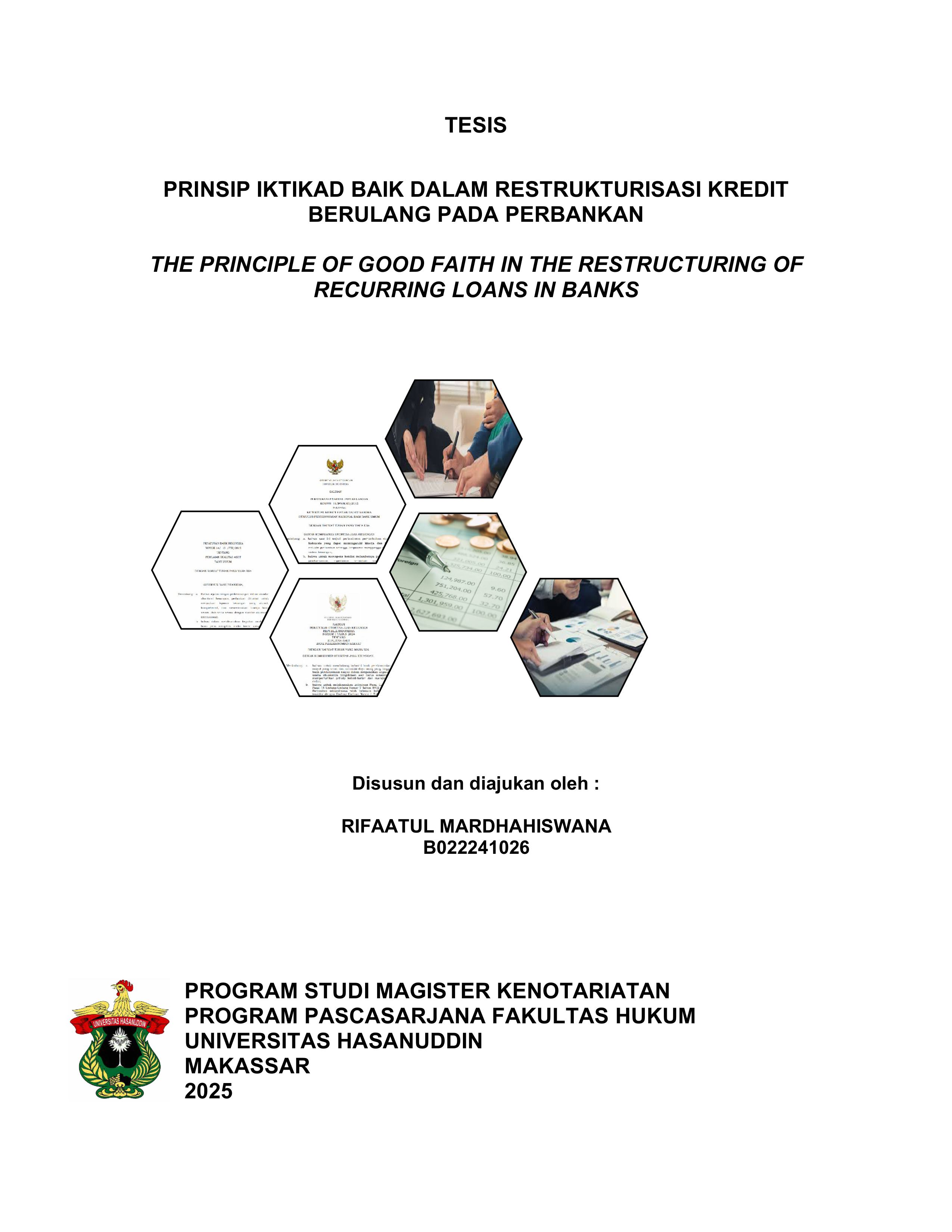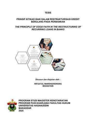 RIFAATUL MARDHAHISWANA (B022241026). PRINSIP IKTIKAD BAIK DALAM RESTRUKTURISASI KREDIT BERULANG PADA PERBANKAN. Di bawah bimbingan Marwah. Restrukturisasi kredit merupakan upaya perbankan dalam membantu Debitor yang mengalami kesulitan membayar kewajibannya. Namun, praktik restrukturisasi kredit yang dilakukan secara berulang menimbulkan permasalahan hukum apabila tidak dilandasi oleh prinsip iktikad baik. Penelitian ini bertujuan untuk mengkaji kesesuaian pemberian restrukturisasi kredit berulang dengan prinsip iktikad baik serta bentuk tanggung jawab hukum perbankan dalam pelaksanaannya. Penelitian ini merupakan penelitian empiris dengan pendekatan deskriptif yang dilakukan di Kota Makassar pada Bank BUMN dan Swasta yang dipilih secara acak. Data primer diperoleh melalui wawancara dengan pihak bank dan debitor, sedangkan data sekunder berasal dari literatur dan peraturan terkait. Pengumpulan data dilakukan melalui penelitian lapangan, dan dianalisis secara deskriptif-analitis berdasarkan teori dan hukum positif yang berlaku. Hasil kajian menunjukkan bahwa pemberian restrukturisasi kredit berulang belum sepenuhnya mencerminkan prinsip iktikad baik, terutama ketika Debitor menyalahgunakan fasilitas tersebut. Pada tahap pra-kontraktual, prinsip iktikad baik telah dijalankan secara prosedural melalui verifikasi data dan komitmen debitor, namun bentuk restrukturisasi yang ditawarkan masih terbatas dan kurang fleksibel. Pada tahap kontraktual, prinsip iktikad baik tercermin dalam transparansi informasi dasar perjanjian, tetapi ruang negosiasi terhadap isi perjanjian masih minim. Sementara itu, pada tahap post-kontraktual, prinsip iktikad baik belum sepenuhnya terpenuhi, ditandai dengan lemahnya penyampaian informasi terkait perubahan suku bunga dan tidak adanya upaya proaktif bank dalam melakukan restrukturisasi ulang. Di sisi lain, bank memiliki tanggung jawab untuk menilai kelayakan kredit secara objektif dan menerapkan prinsip kehati-hatian guna menghindari kerugian serta menjaga stabilitas sistem keuangan. Oleh karena itu, penerapan prinsip iktikad baik secara konsisten oleh kedua belah pihak menjadi syarat mutlak dalam mewujudkan hubungan perbankan yang sehat dan berkeadilan.