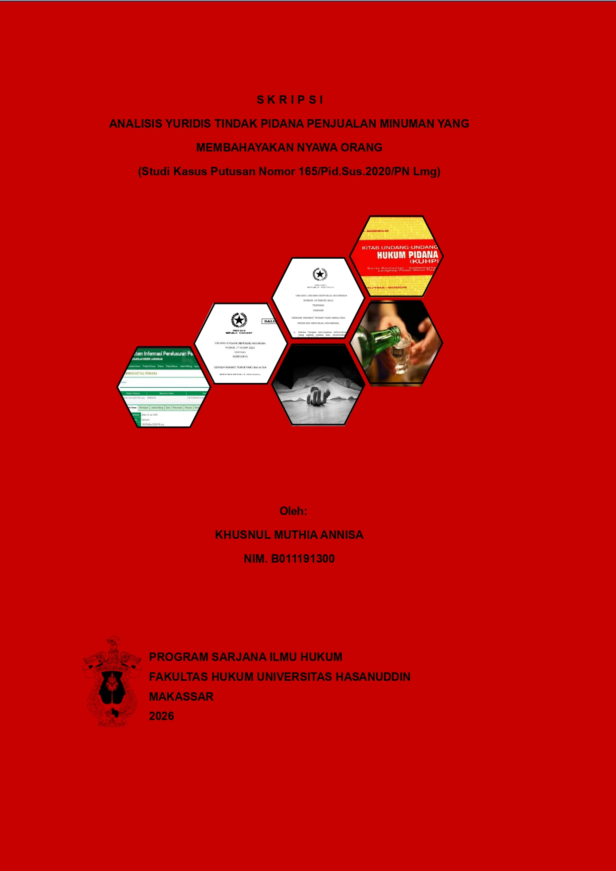 Annisa, Khusnul Muthia (2025) ANALISIS YURIDIS TINDAK PIDANA PENJUALAN MINUMAN MEMABUKKAN YANG MEMBAHAYAKAN NYAWA ORANG (STUDI KASUS PUTUSAN NOMOR 165/PID.SUS/2020/PN LMG) = LEGAL ANALYSIS OF CRIMINAL ACTS OF SELLING BEVERAGES THAT ENDANGER HUMAN LIFE (CASE STUDY: DECISION NUMBER 165/PID.SUS/2020/PN LMG). Skripsi thesis, UNIVERSITAS HASANUDDIN MAKASSAR.