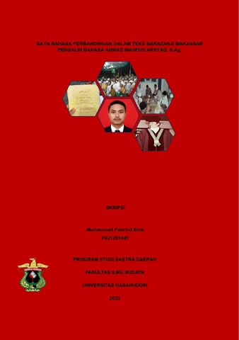Abstrak Muhammad Fahrind Enre. 2025. Gaya bahasa perbandingan dalam teks Barazanji Makassar Pengalih bahasa Ahmad Mahfud Arsyad, S.ag.. Penelitian ini membahas gaya bahasa perbandingan dalam teks Barazanji Makassar karya Ahmad Mahfud Arsyad, S.Ag dengan menggunakan pendekatan stilistika. Latar belakang penelitian berangkat dari tradisi pembacaan Barazanji di masyarakat Makassar yang tidak hanya berfungsi sebagai bentuk perayaan religius, tetapi juga sebagai media pendidikan akhlak dan budaya Islam. Masalah utama penelitian adalah mengidentifikasi jenis gaya bahasa perbandingan yang digunakan serta mendeskripsikan nilai-nilai pendidikan yang terkandung di dalam teks tersebut. Penelitian ini menggunakan metode deskriptif kualitatif dengan teknik analisis stilistika untuk mengungkap pemakaian majas perbandingan seperti metafora, simile, dan personifikasi. Hasil penelitian menunjukkan bahwa teks Barazanji Makassar memanfaatkan beragam gaya bahasa perbandingan yang berfungsi memperindah ungkapan, menegaskan makna, dan menghadirkan kesan estetik yang kuat bagi pembaca maupun pendengar. Selain itu, ditemukan pula nilai-nilai pendidikan yang mencakup aspek religius, moral, sosial, dan budaya yang relevan untuk kehidupan masyarakat sehari-hari. Nilai-nilai tersebut memperkuat posisi Barazanji sebagai warisan sastra Islam yang tidak hanya bernilai estetik, tetapi juga edukatif dan transformatif. Dengan demikian, penelitian ini berkontribusi dalam memperkaya kajian stilistika, pelestarian budaya lokal, serta pengembangan pendidikan berbasis kearifan lokal. Kata Kunci: Barazanji Makassar, stilistika, gaya bahasa perbandingan, nilai pendidikan.