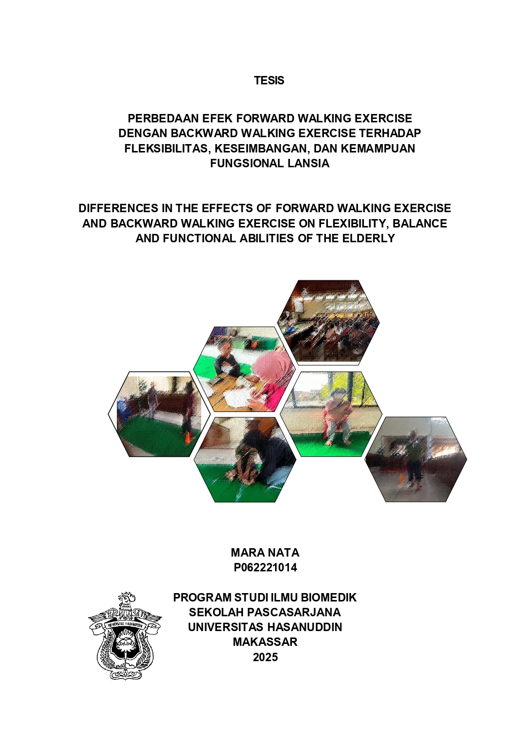 Mara Nata. Perbedaan Efek Forward Walking Exercise dengan Backward Walking Exercise terhadap Fleksibilitas, Keseimbangan, dan Kemampuan Fungsional Lansia. (dibimbing oleh Andi Ariyandy dan Meutiah Mutmainnah) Latar Belakang : Perubahan fisiologis terjadi seiring bertambahnya usia dan selanjutnya memengaruhi seluruh sistem tubuh, sehingga terjadi penurunan fungsi. Penurunan fungsi sistem muskuloskeletal menyebabkan sarkopenia, penurunan kekuatan otot, penurunan fleksibilitas dan keseimbangan, yang pada akhirnya memengaruhi fungsi dan mobilitas lansia. Berjalan merupakan aktivitas sehari-hari yang erat kaitannya dengan status kesehatan dan kualitas hidup. Forward Walking Exercise (FWE) dan Backward Walking Exercise (BWE) merupakan jenis jalan kaki yang bermanfaat bagi kesehatan. Penelitian ini bertujuan untuk mengetahui perbedaan efek Forward Walking Exercise dan Backward Walking Exercise terhadap fleksibilitas, keseimbangan, dan kemampuan fungsional lansia. Metode : Penelitian ini menggunakan quasi eksperimen design dengan pretest-posttest two-group design. Sebanyak 50 partisipan dibagi secara acak menjadi dua kelompok, yaitu kelompok FWE terdiri dari 25 partisipan dan kelompok BWE terdiri dari 25 partisipan. Durasi latihan 30 menit dengan intensitas ringan, latihan dilakukan 3 kali seminggu selama 4 minggu. Teknik pelaksanaan FWE yaitu berjalan maju dimulai dengan heel contacts, toe off, dan swing phase, sedangkan teknik pelaksanaan BWE yaitu berjalan mundur dimulai dengan toe contacts, heel off, dan swing phase. Fleksibilitas diukur dengan modified sit and reach test (MSRT), keseimbangan diukur dengan timed up-and-go test (TUGT), dan kemampuan fungsional diukur dengan five times sit-to-stand test (FTSST). Hasil : Analisis perbandingan antara nilai pre-test dan post-test pada MSRT, TUGT, dan FTSST menunjukkan adanya perbedaan yang signifikan baik pada kelompok FWE maupun kelompok BWE. Analisis perbandingan antara kelompok FWE dan BWE menunjukkan bahwa tidak terdapat perbedaan yang signifikan pada nilai MSRT, TUGT, dan FTSST. Kesimpulan : FWE dan BWE dapat meningkatkan fleksibilitas, keseimbangan, dan kemampuan fungsional lansia, dan efek yang ditimbulkan sama.