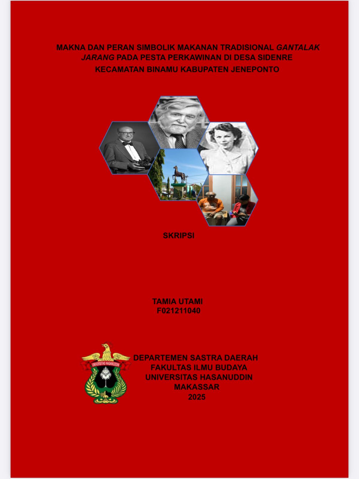 Tamia Utami. 2025 skripsi ini berjudul “Makna dan Peran Simbolik Makanan Tradisional Gantalak Jarang Pada Pesta Perkawinan Di Desa Sidenre Kecamatan Binamu Kabupaten Jeneponto”.(Dibimbing Oleh Hunaeni, S.S., M.Si) Skripsi ini mengkaji makna dan peran simbolik Makanan Tradisional Gantalak Jarang dalam pesta Perkawinan di Desa Sidenre, Kecamatan Binamu, Kabupaten Jeneponto. Gantalak Jarang merupakan makanan tradisional berbahan dasar daging kuda yang diyakini memiliki nilai historis, spiritual, dan sosial. Dalam konteks pesta Perkawinan, makanan ini tidak hanya menjadi sajian kuliner, tetapi juga simbol kehormatan, tanggung jawab, dan identitas budaya masyarakat Jeneponto. Penelitian ini menggunakan pendekatan kualitatif. Data diperoleh melalui observasi partisipatif dan wawancara mendalam terhadap lima informan yang terdiri dari tokoh adat, tokoh agama, Biduang , serta warga masyarakat setempat. Hasil penelitian menunjukkan bahwa Gantalak Jarang memiliki makna simbolik sebagai wujud tanggung jawab laki-laki, simbol keberkahan dan perlindungan spiritual, serta ekspresi rasa syukur dan kebanggaan budaya. Adapun peran simboliknya meliputi fungsi sebagai pengikat ikatan sosial, simbol kesetiakawanan, penanda status sosial, dan bahasa budaya non-verbal. Dengan demikian, Gantalak Jarang bukan sekadar makanan, tetapi juga perangkat budaya yang menyatukan, memperkuat identitas, serta merekatkan masyarakat.