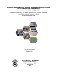 ABSTRAK ANDI KARLINA SYAHRIR. Pengaruh pemberian dangke terhadap perbaikan kadar serotonin dan fungsi kognitif pada pasien skizofrenia yang mendapat terapi risperidone. (Dibimbing oleh Ilhamuddin Azis dan Rosdiana Natzir) Skizofrenia merupakan gangguan mental kronis yang sering disertai dengan disfungsi kognitif. Risperidone adalah terapi utama untuk skizofrenia; namun, efeknya pada fungsi kognitif masih terbatas. Dangke, makanan fermentasi tradisional dari Sulawesi Selatan, memiliki potensi sebagai terapi tambahan melalui modulasi neurotransmitter dan aksis usus-otak. Penelitian ini bertujuan untuk menilai pengaruh pemberian dangke terhadap kadar serotonin serum dan fungsi kognitif pada pasien skizofrenia yang mendapatkan terapi risperidone. Penelitian ini menggunakan desain eksperimental analitik dengan pengaturan kelompok acak pre test-post test. Penelitian ini melibatkan pasien skizofrenia yang memenuhi kriteria inklusi, dibagi menjadi kelompok kontrol (risperidone) dan kelompok perlakuan (risperidone + dangke). Kadar serotonin serum diukur melalui ELISA, dan fungsi kognitif dievaluasi menggunakan MoCA-INA sebelum dan sesudah intervensi selama 4 minggu. Hasil menunjukkan bahwa terapi risperidone, baik tanpa maupun dengan tambahan dangke, secara signifikan meningkatkan kadar serotonin serum dan fungsi kognitif. Meskipun tidak terdapat perbedaan yang signifikan antara kedua kelompok, kelompok perlakuan menunjukkan kecenderungan peningkatan fungsi kognitif yang lebih besar dibandingkan kelompok kontrol. Kesimpulannya, Pemberian dangke sebagai terapi tambahan tidak menunjukkan dampak yang signifikan terhadap kadar serotonin serum maupun fungsi kognitif dalam jangka waktu empat minggu. Namun, temuan ini mengindikasikan potensi dangke sebagai terapi suportif peningkatan fungsi kognitif. ABSTRACT ANDI KARLINA SYAHRIR. The impact of Dangke on serum serotonin levels and cognitive function in schizophrenia patients receiving risperidone. (Supervised by Ilhamuddin Azis and Rosdiana Natzir) Schizophrenia is a chronic mental disorder often accompanied by cognitive dysfunction. Risperidone is the primary therapy for schizophrenia; however, its effects on cognitive function remain limited. Dangke, a traditional fermented food from South Sulawesi, has potential as an adjuvant therapy through neurotransmitter modulation and the gut-brain axis. This study aimed to assess the effect of dangke administration on serum serotonin levels and cognitive function in schizophrenia patients receiving risperidone therapy. Using an analytical experimental design with a pretest–posttest randomized group setup, this study involved schizophrenia patients meeting inclusion criteria, divided into a control group (risperidone only) and a treatment group (risperidone + dangke). Serum serotonin levels were measured via ELISA, and cognitive function was assessed using the MoCA-INA before and after a 4-week intervention. The results showed that risperidone therapy, both with and without dangke supplementation, significantly improved serum serotonin levels and cognitive function. Although no statistically significant difference was observed between the two groups, the treatment group showed a greater tendency toward cognitive function improvement compared to the control group. In conclusion, the administration of dangke as an adjuvant therapy did not show a significant impact on serum serotonin levels or cognitive function within a four-week period. However, these findings indicate the potential of dangke as a supportive therapy for enhancing cognitive function.