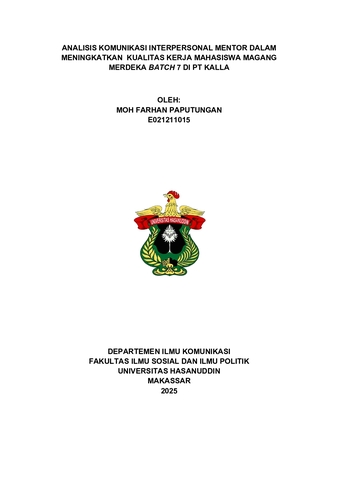 MOH. FARHAN PAPUTUNGAN, Analisis Komunikasi Interpersonal Mentor Dalam Meningkatkan Kualitas Kerja Mahasiswa Magang Merdeka Batch 7 Di PT KALLA. (Dibimbing oleh Prof. Dr. Jeanny Maria Fatimah, M.Si) Latar Belakang. Tingginya angka pengangguran lulusan perguruan tinggi di Indonesia menunjukkan pentingnya program magang sebagai upaya meningkatkan kesiapan kerja mahasiswa, di mana komunikasi interpersonal antara mentor dan mahasiswa memegang peran penting dalam membentuk kualitas kerja selama program Magang Merdeka Batch 7 di PT KALLA. Tujuan Penelitian ini adalah (1) Untuk mengetahui komunikasi interpersonal yang diterapkan mentor dalam membimbing mahasiswa magang merdeka batch 7 di PT Kalla. (2) Untuk mengetahui efektivitas komunikasi interpersonal mentor dalam membimbing mahasiswa magang merdeka batch 7 di PT Kalla. (3) Untuk mengetahui peran komunikasi interpersonal mentor dalam meningkatkan kualitas kerja mahasiswa magang merdeka batch 7 di PT Kalla. Metode. Penelitian ini menggunakan metode wawancara secara langsung dan virtual. Adapun informan dari penelitian ini adalah Mentor dan Mahasiswa Magang Merdeka Batch 7 di PT KALLA. Informan penelitian ini ditentukan secara purposive sampling berdasarkan kriteria tertentu. Tipe Penelitian ini bersifat kualitatif deskriptif dengan menggunakan metode Model Miles & Huberman. Data primer diperoleh melalui kegiatan observasi dan wawancara, sementara data sekunder dihimpun dari berbagai sumber yang telah tersedia, seperti internet, buku, serta literatur lain yang relevan. Hasil. Penelitian ini menunjukkan bahwa komunikasi antara mentor dan mahasiswa magang batch 7 di PT Kalla berlangsung dua arah dengan bentuk komunikasi tatap muka maupun melalui media seperti Whatsapp dan telepon. Efektivitas komunikasi interpersonal mentor yang meliputi keterbukaan, empati, dukungan, sikap positif, dan kesetaraan berperan penting dalam meningkatkan kualitas kerja mahasiswa magang. Komunikasi interpersonal mendorong peningkatan kuantitas kerja, ketepatan waktu, kemandirian, serta membangun komitmen kerja. Kesimpulan. Komunikasi interpersonal mentor di PT Kalla berjalan dua arah secara terbuka, berempati, memberikan dukungan, rasa positif dan kesetaraan. Serta, berperan penting dalam meningkatkan kualitas kerja mahasiswa magang, meliputi kuantitas, ketepatan waktu, kemandirian, dan komitmen, meskipun terdapat hambatan seperti keterbatasan waktu dan perubahan instruksi.
