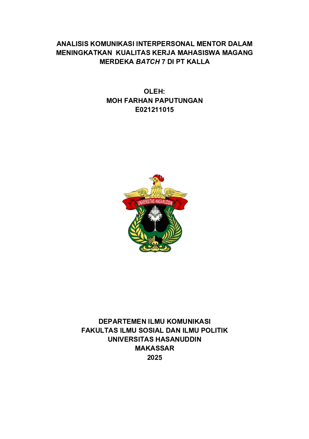PAPUTUNGAN, MOH. FARHAN (2025) ANALISIS KOMUNIKASI INTERPERSONAL MENTOR DALAM MENINGKATKAN KUALITAS KERJA MAHASISWA MAGANG MERDEKA BATCH 7 DI PT KALLA = ANALYSIS OF INTERPERSONAL COMMUNICATION BETWEEN MENTORS AND INTERNS IN IMPROVING THE WORK QUALITY OF MAGANG MERDEKA BATCH 7 STUDENTS AT PT KALLA. Skripsi thesis, UNIVERSITAS HASANUDDIN.