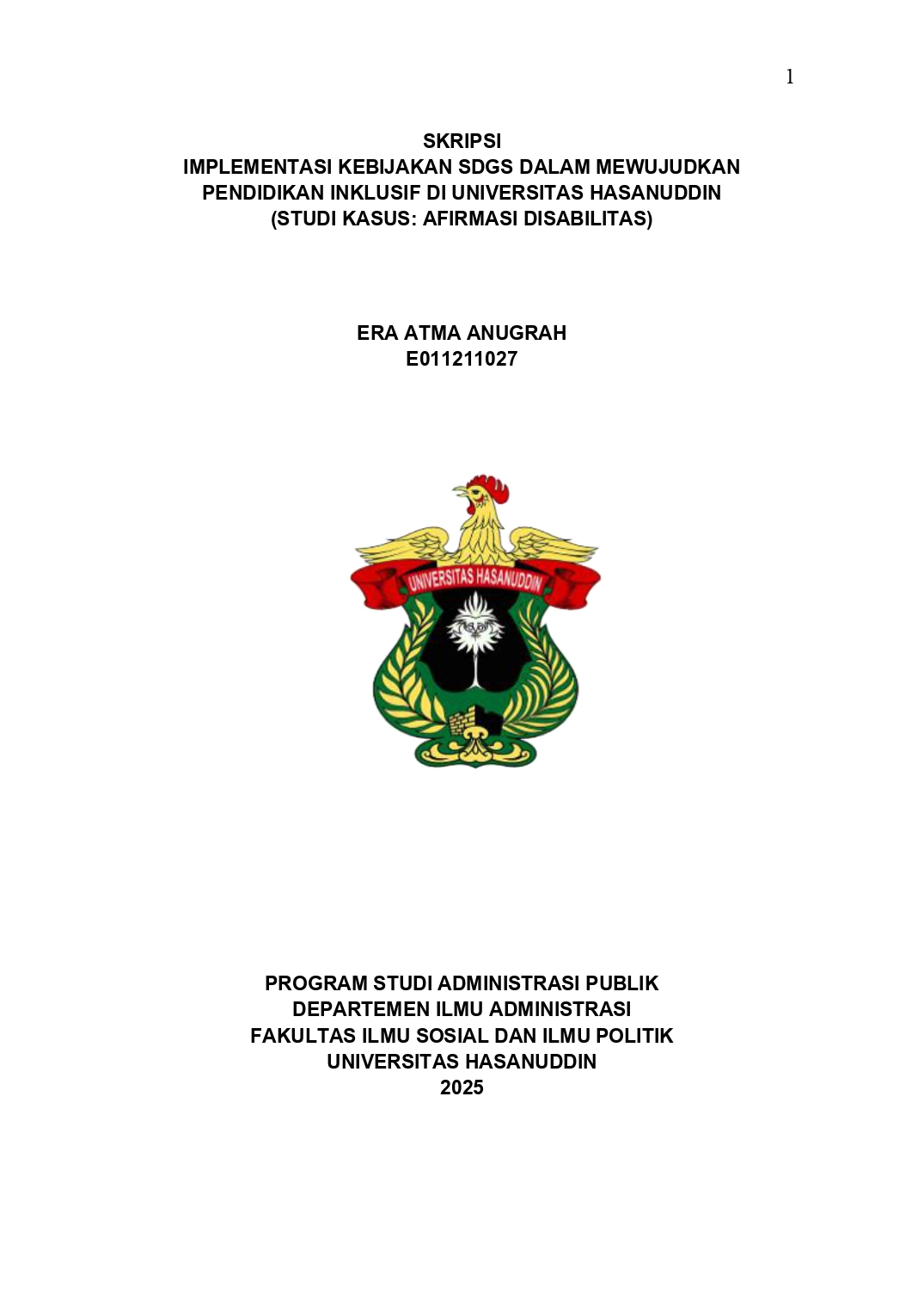 ANUGRAH, ERA ATMA (2025) IMPLEMENTASI KEBIJAKAN SDGS DALAM MEWUJUDKAN PENDIDIKAN INKLUSIF DI UNIVERSITAS HASANUDDIN (STUDI KASUS: AFIRMASI DISABILITAS)=IMPLEMENTATION OF SDGS POLICY IN REALIZING INCLUSIVE EDUCATION AT HASANUDDIN UNIVERSITY (CASE STUDY: DISABILITY AFFIRMATION). Skripsi thesis, UNIVERSITAS HASANUDDIN.