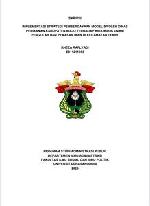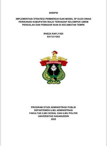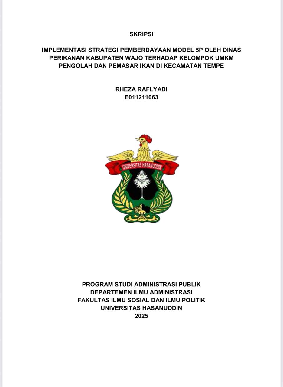 ABSTRAK Rheza Raflyadi (E011211063), Jurusan Administrasi Publik Fakultas Ilmu Sosial Dan Ilmu Politik Universitas Hasanuddin. Implementasi Strategi Pemberdayaan Model 5P oleh Dinas Perikanan Kabupaten Wajo terhadap Kelompok UMKM Pengolah dan Pemasar Ikan di Kecamatan Tempe. Dibimbing oleh Dr. Nurdin Nara, M. Si Penelitian ini menganalisis implementasi strategi pemberdayaan model 5P yang dilakukan oleh Dinas Perikanan Kabupaten Wajo terhadap kelompok Usaha Mikro, Kecil, dan Menengah (UMKM) pengolah dan pemasar ikan di Kecamatan Tempe. Penelitian ini menggunakan pendekatan kualitatif deskriptif dengan metode studi kasus untuk mengeksplorasi dinamika strategi pemberdayaan yang diterapkan. Teknik pengumpulan data yang dilakukan melalui observasi, wawancara dan telaah dokumen. Teknik analisis data yang dilakukan melalui pengumpulan data, kondensasi data, reduksi data, dan penarikan kesimpulan. Indikator pemberdayaan 5P oleh Suharto (1997) meliputi pemungkinan, penguatan, perlindungan, penyokongan, dan pemeliharaan, menjadi dasar analisis. Hasil penelitian menunjukkan bahwa program pelatihan kewirausahaan berhasil menciptakan kondisi yang mendukung pertumbuhan UMKM (pemungkinan), meningkatkan kapasitas dan kemandirian pelaku usaha (penguatan), serta melindungi mereka melalui akses modal dan pasar (perlindungan). Selain itu, bantuan alat produksi mendukung efisiensi dan kualitas produk (penyokongan), meskipun keberlanjutan program sangat bergantung pada alokasi anggaran yang belum stabil (pemeliharaan). Faktor pendukung pemberdayaan mencakup ketersediaan bahan baku yang melimpah dari Danau Tempe dan dukungan pemerintah melalui program pelatihan dan pembinaan. Namun juga memiliki hambatan seperti penggunaan teknik tradisional dalam proses pengolahan masih dilakukan dan ketidakstabilan alokasi anggaran APBD untuk program pelatihan. Penelitian ini merekomendasikan agar Dinas Perikanan Kabupaten Wajo meningkatkan frekuensi dan kualitas pelatihan, peningkatan alokasi anggaran pemerintah daerah untuk mendukung keberlanjutan program pemberdayaan UMKM, dan menyediakan akses terhadap teknologi pengolahan modern sehingga dapat berkontribusi pada pertumbuhan ekonomi lokal yang inklusif dan berkelanjutan.