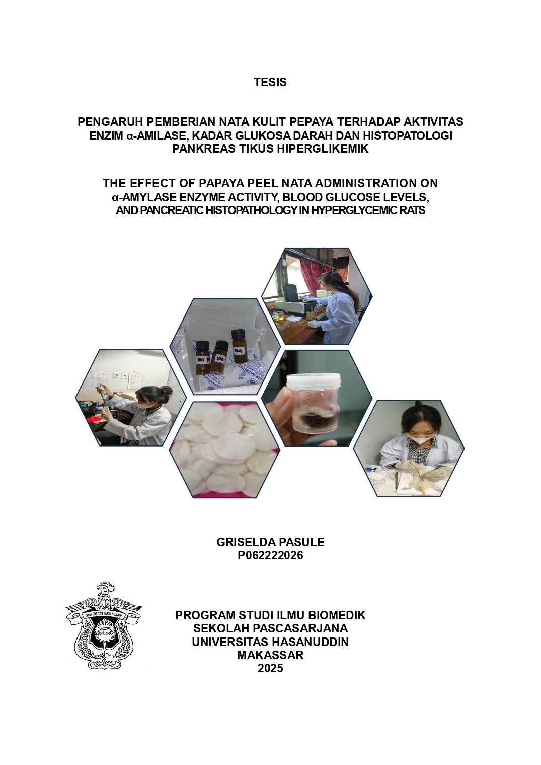 GRISELDA PASULE. Pengaruh Pemberian Nata Kulit Pepaya terhadap Aktivitas Enzim α-amilase, Kadar Glukosa Darah dan Histopatologi Pankreas Tikus Hiperglikemik. (dibimbing oleh Rosdiana Natzir dan Syahrijuita Kadir). Latar Belakang: Nata kulit pepaya merupakan produk hasil fermentasi dari kulit buah pepaya yang mengandung serat pangan, yang berpotensi memberikan manfaat bagi kesehatan. Tujuan: Penelitian ini bertujuan untuk menguji pengaruh pemberian nata dari kulit pepaya terhadap aktivitas enzim α-amilase, kadar glukosa darah puasa (GDP), dan gambaran histopatologi pankreas pada tikus hiperglikemik. Metode: Penelitian ini dibagi menjadi empat bagian, yaitu 1) Pembuatan nata kulit pepaya dengan teknik fermentasi menggunakan Acetobacter xylinum. 2) Uji in vivo, ada 24 ekor tikus Wistar jantan dibagi ke dalam enam kelompok perlakuan, terdiri atas kontrol normal (KN), kontrol negatif (K-), kontrol positif (K+), serta tiga kelompok perlakuan dengan nata kulit pepaya masing-masing dosis 0.5 g (NKP1), nata kulit pepaya dosis 0.6 g (NKP2), dan nata kulit pepaya dosis 0.7 g (NKP3). Semua kelompok selain kontrol normal, diinduksi streptozotocin (STZ) dengan dosis tunggal 40 mg/kg BB. Kadar GDP tikus diukur sebelum dan sesudah induksi STZ, dan serta pasca perlakuan 3) Uji aktivitas enzim α-amilase pada organ usus halus tikus yang diambil pasca perlakuan dan 4) Pemeriksaan histopatologi organ pankreas tikus yang diambil pasca perlakuan. Hasil: Hasil penelitian menunjukkan terjadi penurunan signifikan kadar GDP pada NKP1, NKP2, dan NKP3 (p<0.05). Meskipun tidak terdapat perbedaan signifikan pada aktivitas enzim α-amilase antar kelompok (p>0.05), namun histopatologi pankreas menunjukkan perbaikan struktur pulau Langerhans, terutama pada kelompok dosis tertinggi (NKP3). Perbaikan ini ditandai dengan peningkatan luas dan diameter pulau Langerhans serta regenerasi sel β pankreas. Kesimpulan: Nata kulit pepaya dapat menurunkan kadar glukosa darah puasa (GDP) dan tampak perbaikan histopatologi pankreas tikus hiperglikemik, sedangkan untuk aktivitas enzim α-amilase masih memerlukan kajian lebih lanjut.
