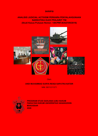 NATSIR, ANDI MUH.SURYA RESQI SAPUTRA (2026) Analisis Judicial Activism Perkara Penyalahgunaan Narkotika Oleh Prajurit Tni (Studi Kasus Putusan Nomor: 14K/PMT.III/AD/VIII/2016) = Analysis of Judicial Activism in Narcotics Abuse Cases by TNI Personnel (Case Study of Decision Number: 14K/PMT.III/AD/VIII/2016). Skripsi thesis, UNIVERSITAS HASANUDDIN MAKASSAR.