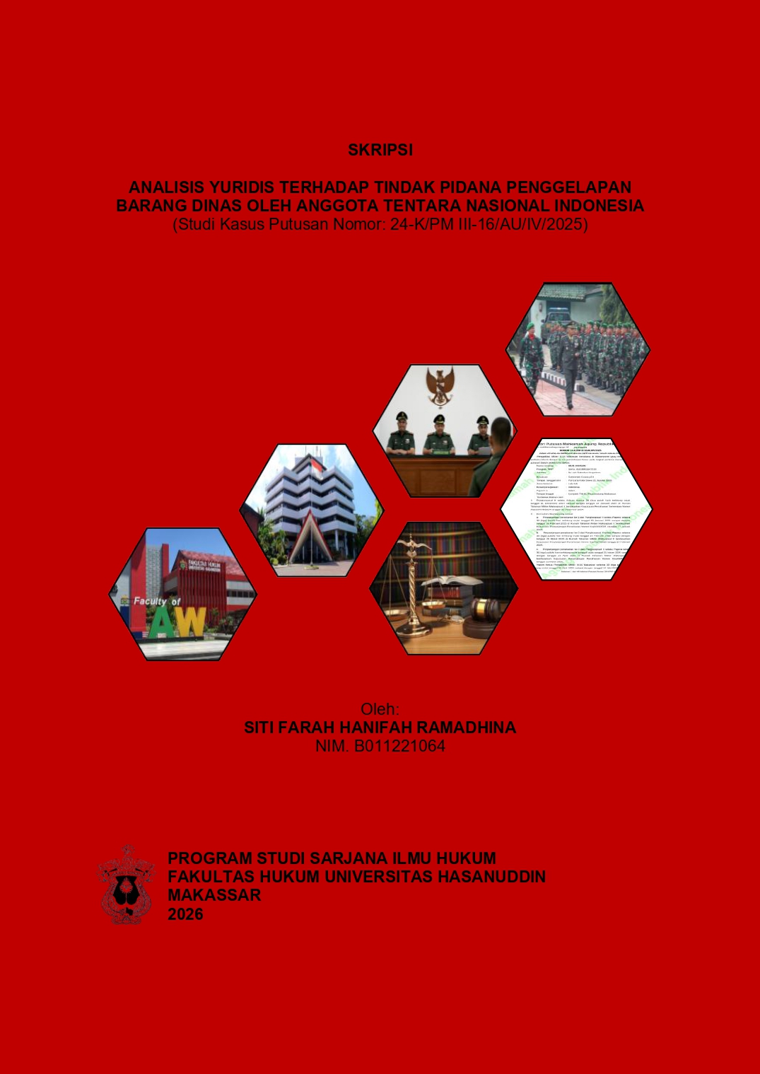 RAMADHINA, SITI FARAH HANIFAH (2026) ANALISIS YURIDIS TERHADAP TINDAK PIDANA PENGGELAPAN BARANG DINAS OLEH ANGGOTA TENTARA NASIONAL INDONESIA (Studi Kasus Putusan Nomor: 24-K/PM III-16/AU/IV/2025) = Legal Analysis of the Criminal Act of Embezzlement of Official Property by Members of the Indonesian National Armed Forces (Case Study of Decision Number: 24-K/PM III-16/AU/IV/2025). Skripsi thesis, UNIVERSITAS HASANUDDIN MAKASSAR.