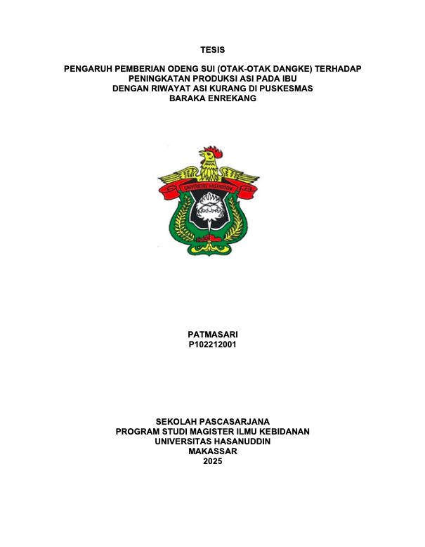 Patmasari. Pengaruh Pemberian Odeng Sui (Otak-Otak Dangke) Terhadap Peningkatan Produksi ASI Pada Ibu Dengan Riwayat ASI Kurang di Puskesmas Baraka Enrekang ( dibimbing oleh Andi Nilawati dan Healthy Hidayanty ) Latar belakang: Air susu ibu (ASI) adalah emulsi lemak dalam larutan protein, laktosa, dan garam-garam organik yang disekresikan oleh kedua belah kelenjar payudara ibu. Tujuan: Penelitian ini bertujuan untuk menganalisis pengaruh pemberian odeng sui (otak-otak dangke) terhadap peningkatan produksi ASI pada ibu dengan riwayat ASI kurang. Metode: Penelitian ini menggunakan desain kuasi-eksperimental, 135 ibu dibagi menjadi tiga kelompok perlakuan. Kelompok satu (I) menerima odeng Sui sebanyak 100 gram setiap hari untuk ibu dengan riwayat ASI kurang selama tiga bulan. Kelompok dua (II) menerima perawatan payudara dari hari ketiga hingga hari keempat belas setelah persalinan setiap hari (mulai jam 08.00 pagi) Kelompok ketiga (III) menerima odeng Sui dan perawatan payudara sebanyak 100 gram setiap hari. Pada penelitian ini menggunakan uji Kruskal Wallis, Uji post hocdan uji regresi logistik. Hasil: Pada kelompok oden sui dilihat dari BB bayi menunjukkan nilai p value 0,011, perawatan payudara menunjukkan nilai p value 0,038 dan oden sui disertai perawatan payudara menunjukkan nilai p value 0,000 (p < 0,05). Kesimpulan: Ketiga intervensi mengalami peningkatan produksi ASI yang signifikan pada semua intervensi tetapi pemberian oden sui dan perawatan payudara lebih memberikan efek yang lebih signifikan dalam meningkatkan produksi ASI pada ibu riwayat ASI kurang.