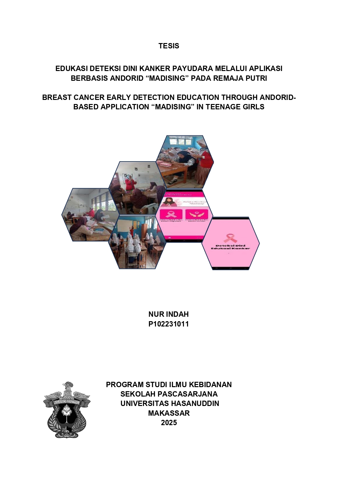 ABSTRAK NUR INDAH. Edukasi Deteksi Dini Kanker Payudara Melalui Aplikasi “Madising” Berbasis Android Pada Remaja Putri (Dibimbing oleh Andi Nilawati Usman dan Yusring Sanusi Baso) Latar Belakang : Kanker payudara adalah kondisi sel-sel jaringan payudara tumbuh tidak terkendali, sering kali menyebabkan kematian pada wanita. Deteksi dini melalui metode pemeriksaan payudara sendiri (SADARI) dapat meningkatkan harapan hidup. Edukasi menggunakan media aplikasi dapat menjadi cara efektif untuk meningkatkan pengetahuan, sikap dan perilaku deteksi dini kanker payudara.Tujuan : Untuk mengevaluasi pengaruh media edukasi berbasis aplikasi Android Madising tentang deteksi dini kanker payudara terhadap pengetahuan, sikap dan perilaku Remaja Putri. Metode : Penelitian ini menggunakan metode Research and Development (R&D) dengan pendekatan Quasi-Eksperimental desain non equivalent control group design Pretest-Posttest. populasi terdiri dari 62 Remaja Putri. tekhnik pengambilan sampel menggunakan purposive sampling (total sampling) kemudian membagi dua kelompok yaitu intervensi menggunakan aplikasi Madising dan kelompok kontrol diberikan leaflet. Data dikumpulkan melalui pretest dan posttest menggunakan kuesioner dan dianalisis dengan uji Wilcoxon dan Mann Whitney. Hasil : Penelitian ini menunjukkan adanya peningkatan pengetahuan, sikap dan perilaku Remaja Putri yang signifikan setelah mendapatkan edukasi menggunakan aplikasi Madising, dibandingkan dengan yang diberikan leaflet. Pada kelompok intervensi menunjukkan adanya peningkatan pengetahuan kategori baik 18 responden (58,1%), sikap kategori sangat baik 18 responden (58.1%) dan perilaku melakukan SADARI 18 responden (58.1%). Sedangkan pada kelompok kontrol kategori baik 3 responden (9,7%), sikap 4 responden (12.9%), dan perilaku melakukan SADARI 4 responden (12.9%). Remaja Putri dalam deteksi dini kanker payudara setelah diberikan intervensi Aplikasi Madising dan leflet. Kelompok intervensi menunjukkan peningkatan yang signifikan (p-value < 0.05) dibandingkan dengan kelompok kontrol nilai signifikasi dengan nilai (p-value > 0.05). Kesimpulan: Ada pengaruh media edukasi berbasis aplikasi Android Madising tentang deteksi dini kanker payudara terhadap pengetahuan, sikap dan perilaku remaja putri. ABSTRACT NUR INDAH. Early Detection of Breast Cancer Education Through the Android-Based "Madising" Application for Young Women (Supervised by Andi Nilawati Usman and Yusring Sanusi Baso) Background: Breast cancer is a condition where breast tissue cells grow uncontrollably, often causing death in women. Early detection through the breast self-examination method (SADARI) can increase life expectancy. Education using application media can be an effective way to improve knowledge, attitudes and behavior of early detection of breast cancer. Objective: To evaluate the effect of educational media based on the Madising Android application on early detection of breast cancer on the knowledge, attitudes, and behavior of Young Women. Method: This study uses the Research and Development (R&D) method with a Quasi-Experimental approach, non-equivalent control group design, and Pretest- Posttest. The population consists of 62 Young Women. The sampling technique uses purposive sampling (total sampling) then divides two groups, namely the intervention using the Madising application and the control group is given a leaflet. Data were collected through pretest and posttest using questionnaires and analyzed using the Wilcoxon and Mann Whitney tests. Results: This study showed a significant increase in young women's knowledge, attitudes, and behavior after receiving education using the Madising application, compared to those given leaflets. In the intervention group, there was an increase in knowledge in the good category of 18 respondents (58.1%), attitudes in the outstanding category of 18 respondents (58.1%), and behavior of performing BSE 18 respondents (58.1%). While in the control group, the good category was three respondents (9.7%), attitudes in 4 respondents (12.9%), and behavior of performing BSE 4 respondents (12.9%). Young women in early detection of breast cancer after being given the Madising Application and leaflet intervention. The intervention group showed a significant increase (p-value <0.05) compared to the control group with a significance value (p-value> 0.05). Conclusion: Educational media based on the Madising Android application influences the early detection of breast cancer and the knowledge, attitudes, and behavior of young women.
