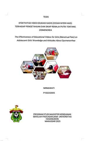 NIRMAWATI. Efektivitas Video Edukasi Gadis (Cegah Nyeri Haid) Terhadap Pengetahuan Dan Sikap Remaja Putri Tentang Dismenorea (dibimbing oleh Fatmawati Madya dan Mardiana Ahmad). Latar Belakang : Dismenorea merupakan salah satu gangguan menstruasi yang paling sering dialami oleh remaja putri dan berdampak signifikan terhadap aktivitas sehari-hari, prestasi akademik, dan kesejahteraan psikologis. Literasi kesehatan menstruasi yang rendah menyebabkan remaja sering mengabaikan gejala dismenorea dan enggan mencari pertolongan medis. Tujuan : Mengevaluasi efektivitas video edukasi Gadis (Cegah Nyeri Haid) terhadap pengetahuan dan perubahan sikap remaja putri tentang dismenorea. Metode: Penelitian ini menggunakan desain kuasi-eksperimen dengan pendekatan pretest-posttest dua kelompok (intervensi dan kontrol). Populasi penelitian adalah seluruh siswi kelas VIII dan IX di SIT Ikhtiar Makassar sebanyak 50 orang yang sekaligus menjadi sampel penelitian (total sampling). Sampel dibagi secara acak sederhana menjadi dua kelompok, kelompok intervensi slide, ceramah, video edukasi (n=25) dan kelompok kontrol slide dan ceramah (n=25). Intervensi video edukasi diberikan sebanyak delapan kali selama tiga bulan. Data dikumpulkan menggunakan kuesioner pengetahuan dan sikap dengan skala Likert yang telah diuji validitas dan reliabilitasnya. Analisis data dilakukan menggunakan uji Wilcoxon dan MannWhitney. Hasil: Pengetahuan baik meningkat dari 0 menjadi 20 orang, kategori cukup menurun dari 7 menjadi 5 orang, dan kategori kurang berkurang dari 18 menjadi 0 orang. Sementara itu, pada kelompok kontrol, peserta dengan pengetahuan baik meningkat dari 2 menjadi 12 orang, kategori cukup naik dari 5menjadi 8 orang, dan kategori kurang menurun dari 18 menjadi 5 orang. padapersentase sikap positif kelompok intervensi meningkat dari 24% (6 orang) menjadi 88% (22 orang), kelompok kontrol meningkat dari 8% (2 orang) menjadi 32% (8 orang). Uji Wilcoxon kelompok intervensi pengetahuan (p = 0,000) dan sikap (p = 0,000), kelompok kontrol pengetahuan (p = 0,000) dan sikap (p = 0,002). Uji Mann-Whitney kedua kelompok pengetahuan (p = 0,000) dan sikap (p = 0,000) Kesimpulan: Video edukasi Gadis efektif meningkatkan pengetahuan dan sikap remaja putri tentang dismenorea dibandingkan dengan pemberian slide dan ceramah.