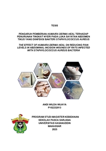 ANDI WILDA WIJAYA Pengaruh pemberian humaira derma heal terhadap penurunan tingkat nyeri pada luka sayatan abdomen tikus yang diinfeksi bakteri Staphylococcus aureus (dibimbing Oleh Andi Nilawati Usman dan St. Maisuri T. Chalid). Latar Belakang: Luka sayat atau robekan pada perineum akibat persalinan pervaginam seringkali menimbulkan nyeri berat dan berisiko tinggi mengalami infeksi, terutama oleh bakteri Staphylococcus aureus. Penanganan nyeri dan penyembuhan luka secara konvensional memiliki keterbatasan. Oleh karena itu, dikembangkan terapi komplementer berupa sediaan topikal Humaira Derma Heal, kombinasi minyak ayam dan Virgin Coconut Oil (VCO), yang kaya akan asam lemak esensial, antimikroba, dan antiinflamasi. Tujuan: Mengetahui pengaruh pemberian Humaira Derma Heal terhadap penurunan tingkat nyeri luka sayatan abdomen pada tikus yang diinfeksi Staphylococcus aureus. Metode: Penelitian ini menggunakan desain eksperimental laboratorium post-test only with control group design. Sebanyak 28 ekor tikus betina jenis Rattus norvegicus dibagi dalam tiga kelompok perlakuan: kelompok kontrol (antibiotik dan antinyeri), kelompok perlakuan dengan Humaira Derma Heal (60%:40%), dan kelompok perlakuan Humaira Derma Heal (20%:80%). Evaluasi nyeri dilakukan menggunakan Rat Grimace Scale selama 17 hari. Hasil: Hasil menunjukkan bahwa kelompok perlakuan Humaira Derma Heal (60%:40%) mengalami penurunan nyeri lebih cepat dibanding kelompok kontrol dan kelompok Humaira Derma Heal (20%:80%), dengan skor nyeri mencapai nol pada hari ke-10. Analisis Kruskal-Wallis menunjukkan perbedaan bermakna antar kelompok (p<0,05), khususnya pada hari ke-6 hingga ke-9. Kesimpulan: Pemberian Humaira Derma Heal efektif menurunkan tingkat nyeri luka sayatan abdomen pada tikus yang diinfeksi Staphylococcus aureus. Produk ini memiliki potensi besar sebagai terapi komplementer dalam manajemen nyeri luka sayatan atau robekan pada perineum dan mendukung pengembangan obat berbasis bahan alami lokal
