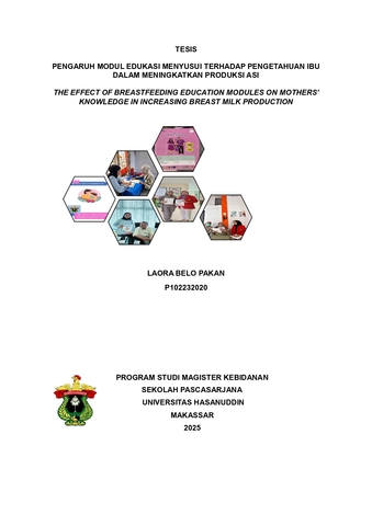ABSTRAK LAORA BELO PAKAN. Pengaruh modul edukasi menyusui terhadap pengetahuan ibu dalam meningkatkan produksi ASI.(dibimbing oleh Mardiana Ahmad dan Jumrah) Latar Belakang: Salah satu penyebab utama rendahnya ASI eksklusif di Palopo adalah kurangnya pengetahuan ibu Primigravida mengenai produksi ASI dan proses menyusui. Banyak ibu di Palopo yang mengeluh ASI-nya tidak keluar atau keluar sangat sedikit setelah salah satu cara untuk meningkatkan pengetahuan ibu primigravida menggunakan modul edukasi. Tujuan: Menganalisis pengaruh modul edukasi menyusui terhadap pengetahuan ibu dalam meningkatkan produksi ASI. Metode: Kombinasi R & D model Borg and Gall dengan quasi-eksperimen two group pre post test design. Populasi semua ibu hamil diwilayah Puskesmas Mungkajang dan Wara Utara, sample primigravida. Teknik penarikan sample menggunakan rumus Lameshow penarikan sample secara purposive, jumlah sample 92. Sample dibagi 2 kelompok intervensi 46 diedukasi dengan modul edukasi menyusui. Kelompok kontrol 46 diedukasi dengan buku KIA. lama edukasi 4 minggu durasi 60 menit. Pengetahuan di uji menggunakan kuesioner pre dan post. Analisis data menggunakan uji Wilcoxon, Chi-Square, Fisher’s, Man-Whitnney. Hasil: Pengetahuan kelompok intervensi pretest pertemuan 1-4 rata-rata 54.3% setelah dilakukan post test pengetahuan meningkat menjadi 100 %. Kelompok control pertemuan 1-4 pengetahuan pre test 60.9 % setelah post test rata-rata 82.6 %. analisis statistik menunjukan bahwa pertemuan ke-1,2,3, dan 4 diperoleh dengan nilai p=0.000 (p<0.05), maka dapat disimpulkan bahwa terdapat peningkatan pengetahuan responden sebelum dan setelah pemberian Modul edukasi menyusui. Kelompok intervensi menunjukkan peningkatan pengetahuan yang lebih cepat dan lebih tinggi dibandingkan kelompok kontrol. Penelitian ini mengindikasikan bahwa edukasi menyusui berperan penting dalam meningkatkan keberhasilan laktasi pada primigravida. Kesimpulan: Modul edukasi menyusui dapat meningkatkan pengetahuan primigravida dan berdampak signifikan pada peningkatan produksi ASI.