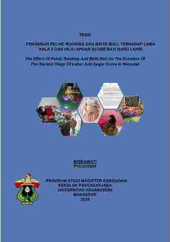 MISBAWATI, Pengaruh Pelvic Rocking Dan Birth Ball Terhadap Lama Kala II Dan Nilai APGAR Score di 3 TPMB dan 2 Puskesmas di Kabupaten Gowa (Dibimbing oleh Mardiana Ahmad dan Jumrah) Latar belakang : Proses persalinan kala II yang berlangsung terlalu lama dapat meningkatkan risiko komplikasi obstetri pada ibu dan bayi, seperti perdarahan postpartum, infeksi, serta asfiksia neonatorum. Salah satu pendekatan non-farmakologis yang dinilai aman dan efektif dalam mempercepat persalinan adalah kombinasi metode Pelvic Rocking dan Birth Ball. Gerakan ritmis pada panggul dapat membantu penurunan kepala janin, meningkatkan kenyamanan ibu, serta mempermudah proses mengejan. Tujuan : Penelitian ini bertujuan untuk menganalisis pengaruh metode Pelvic Rocking dan Birth Ball terhadap lama kala II serta nilai APGAR bayi baru lahir, serta menilai hubungan antara lama kala II dan skor APGAR. Metode : Penelitian menggunakan desain kuasi-eksperimen dengan pendekatan non-randomized control posttest-only design. Sampel terdiri dari 40 ibu bersalin primigravida cukup bulan yang dibagi dalam dua kelompok: intervensi dan kontrol. Kelompok intervensi diberikan metode Pelvic Rocking dan Birth Ball selama 10–20 menit saat tidak ada kontraksi, sedangkan kelompok kontrol menjalani mobilisasi ringan (jalan kaki). Analisis data menggunakan uji Mann-Whitney dan Spearman’s rho. Hasil : Terdapat perbedaan signifikan lama kala II antara kelompok intervensi dan kontrol (p=0,000), dengan median 18 menit dan 45 menit. Namun, nilai APGAR pada menit ke-5 dan ke-10 tidak menunjukkan perbedaan signifikan (p>0,05). Tidak ditemukan hubungan yang signifikan antara lama kala II dan nilai APGAR. Kesimpulan : Metode Pelvic Rocking dan Birth Ball efektif memperpendek kala II, namun tidak berpengaruh signifikan terhadap skor APGAR bayi baru lahir. Kata kunci: Pelvic Rocking, Birth Ball, kala II, APGAR Score, persalinan, metode non-farmakolog