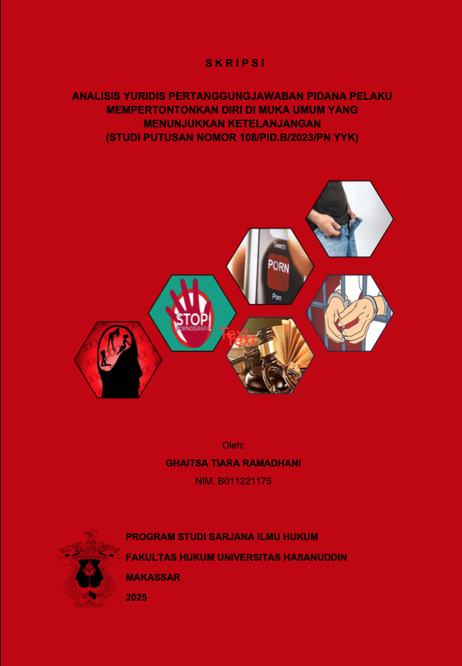RAMADHANI, GHAITSA TIARA (2026) Analisis Yuridis Pertanggungjawaban Pidana Pelaku Mempertontonkan Diri Di Muka Umum Yang Menunjukkan Ketelanjangan (Studi Putusan Nomor 108/Pid.B/2023/PN Yyk) = A Juridical Analysis of Criminal Liability for Offenders Exhibiting Themselves in Public Showing Nudity (Study of Decision Number 108/Pid.B/2023/PN. Yyk). Skripsi thesis, UNIVERSITAS HASANUDDIN MAKASSAR.