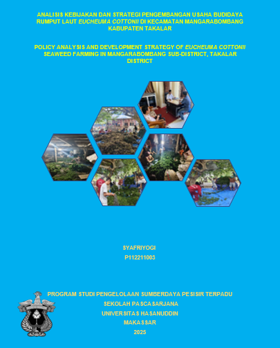 SYAFRIYOGI, SYAFRIYOGI (2025) ANALISIS KEBIJAKAN DAN STRATEGI PENGEMBANGAN USAHA BUDIDAYA RUMPUT LAUT EUCHEMA COTONII DI KECAMATAN MANGARABOMBANG KABUPATEN TAKALAR = POLICY ANALYSIS AND DEVELOPMENT STRATEGY OF EUCHEUMA COTTONII SEAWEED FARMING IN MANGARABOMBANG SUB-DISTRICT, TAKALAR DISTRICT. Thesis thesis, Universitas Hasanuddin.