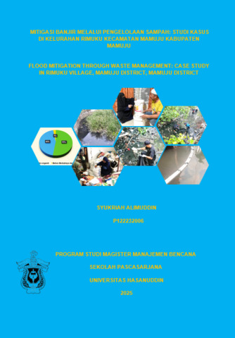 Syukriah Alimuddin. Mitigasi Banjir Melalui Pengelolaan Sampah: Studi Kasus di Kelurahan Rimuku Kecamatan Mamuju Kabupaten Mamuju (dibimbing oleh Baharuddin dan Evi Aprianti) Latar Belakang. Banjir merupakan bencana serius yang dihadapi banyak daerah dan berdampak signifikan pada lingkungan, sosial, dan ekonomi masyarakat. Salah satu faktor penyebab banjir yaitu sistem drainase yang buruk dan tingginya timbulan sampah yang tidak terkelola. Sampah yang menyumbat saluran air menjadi salah satu faktor utama penyebab banjir yang terjadi hampir setiap tahun. Tujuan. Penelitian ini bertujuan untuk menganalisis jenis-jenis sampah yang paling sering menyebabkan penyumbatan saluran air di Kelurahan Rimuku, menganalisis dampak sampah terhadap banjir, dan merumuskan strategi mitigasi banjir melalui pengelolaan sampah yang lebih baik. Metode. Penelitian menggunakan pendekatan deskriptif kualitatif dan kuantitatif dengan pengumpulan data melalui observasi lapangan, wawancara, kuesioner terhadap 389 responden, serta studi dokumentasi. Analisis dilakukan dengan metode SWOT, IFE-EFE, dan penyusunan strategi berbasis hasil analisis tersebut. Hasil. Hasil penelitian menunjukkan bahwa sampah plastik (92,1%) dan sampah organik (76,3%) merupakan jenis yang paling sering menyebabkan penyumbatan saluran air. Pengelolaan sampah di Kelurahan Rimuku masih belum optimal, dengan hanya 21,97% sampah yang terkelola. Upaya mitigasi pengelolaan sampah yang paling dominan dilakukan di Kelurahan Rimuku adalah program bank sampah, kegiatan kampanye kebersihan dan gotong royong. Hasil analisis matriks SWOT menunjukkan strategi mitigasi yang diusulkan mencakup optimalisasi program bank sampah berbasis komunitas, penguatan edukasi berbasis kearifan lokal, penerapan teknologi sederhana untuk mendukung sistem drainase, serta pengembangan ekonomi sirkular melalui produk hasil pengelolaan sampah. Kesimpulan. Pengelolaan sampah yang terintegrasi dan partisipatif menjadi kunci dalam mitigasi banjir. Keterlibatan masyarakat, penguatan kelembagaan lokal, serta dukungan kebijakan pemerintah daerah merupakan fondasi utama dalam menciptakan sistem pengelolaan sampah yang efektif untuk mencegah banjir di Kelurahan Rimuku.