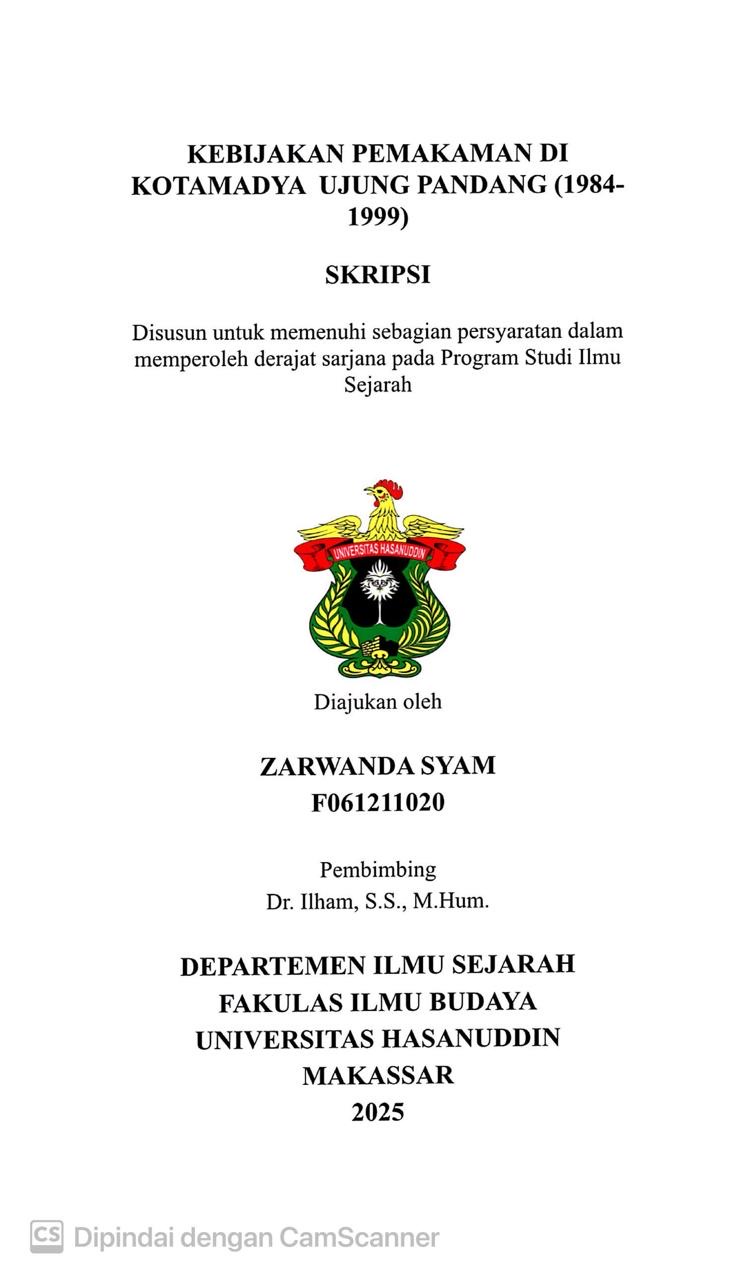 SYAM, ZARWANDA (2025) Kebijakan Pemakaman di Kotamadya Ujung Pandang tahun 1984-1999 = Burial Policy in Ujung Pandang Municipality 1984-1999. Skripsi thesis, Universitas Hasanuddin.