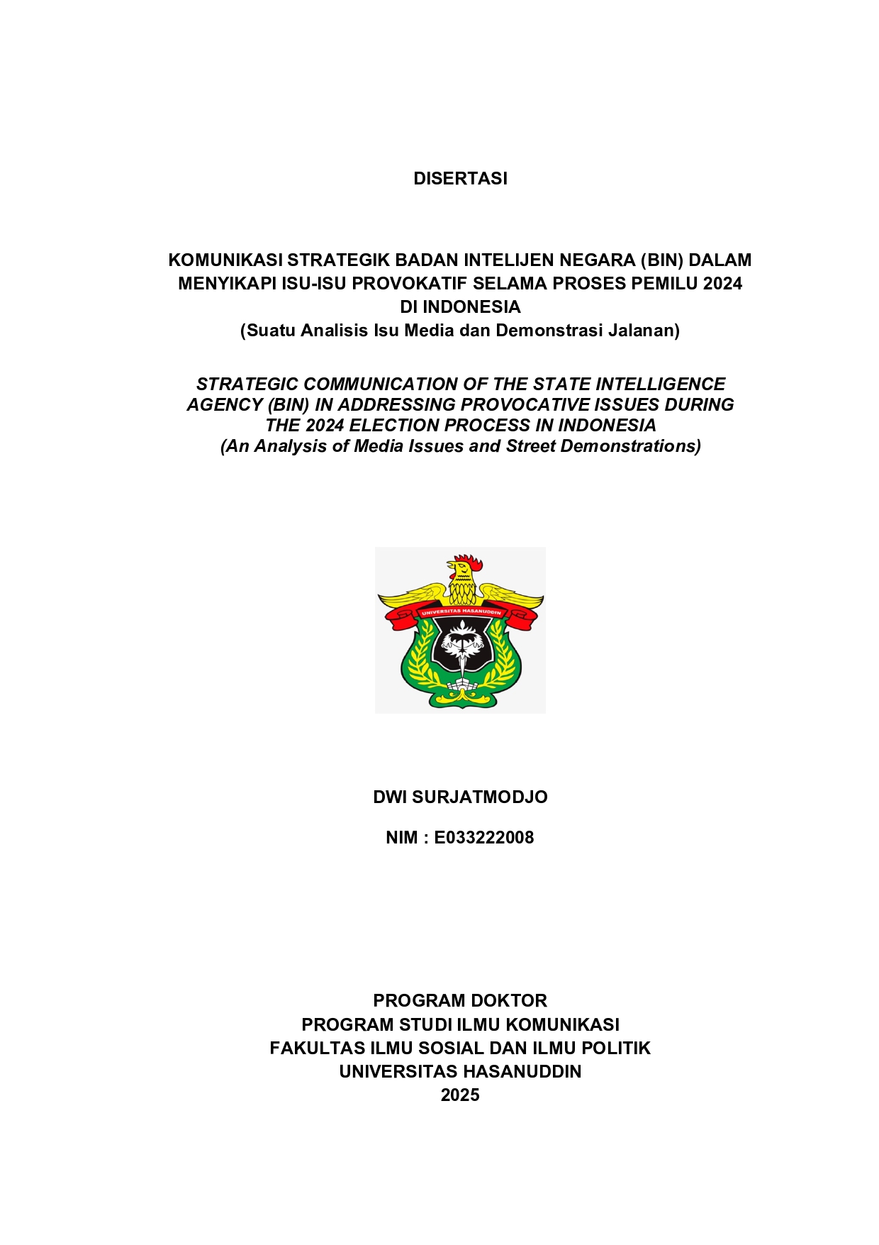SURJATMODJO, DWI (2025) KOMUNIKASI STRATEGIK BADAN INTELIJEN NEGARA (BIN) DALAM MENYIKAPI ISU-ISU PROVOKATIF SELAMA PROSES PEMILU 2024 DI INDONESIA (Suatu Analisis Isu Media dan Demonstrasi Jalanan) = STRATEGIC COMMUNICATION OF THE STATE INTELLIGENCE AGENCY (BIN) IN ADDRESSING PROVOCATIVE ISSUES DURING THE 2024 ELECTION PROCESS IN INDONESIA (An Analysis of Media Issues and Street Demonstrations). Disertasi thesis, Universitas Hasanuddin.