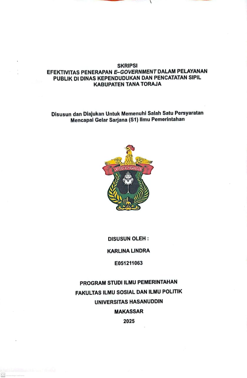 LINDRA, KARLINA (2025) EFEKTIVITAS PENERAPAN E–GOVERNMENT DALAM PELAYANAN PUBLIK DI DINAS KEPENDUDUKAN DAN PENCATATAN SIPIL KABUPATEN TANA TORAJA = EFFECTIVENESS OF E-GOVERNMENT IMPLEMENTATION IN PUBLIC SERVICES AT THE POPULATION AND CIVIL REGISTRATION SERVICE OF TANA TORAJA REGENCY. Skripsi thesis, Universitas Hasanuddin.
