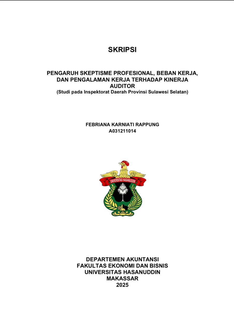 RAPPUNG, FEBRIANA KARNIATI (2025) Pengaruh Skeptisme Profesional, Beban Kerja, dan Pengalaman Kerja terhadap Kinerja Auditor (Studi pada Inspektorat Daerah Provinsi Sulawesi Selatan) = The Influence Of Professional Skepticism, Workload, And Work Experience On Auditor Performance (Study at the Regional Inspectorate of South Sulawesi Province). Skripsi thesis, Universitas Hasanuddin.