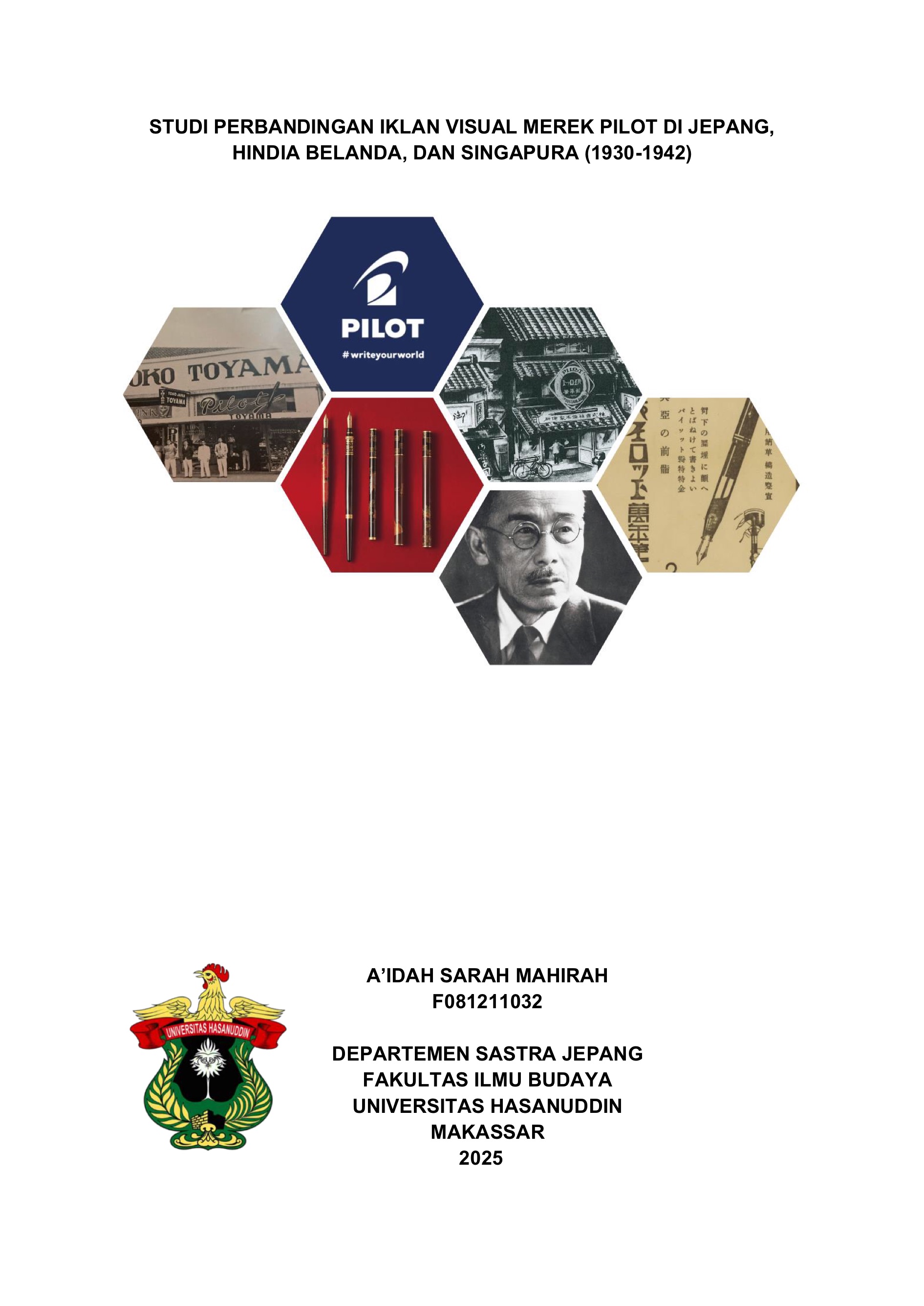 MAHIRAH, A'IDAH SARAH (2025) STUDI PERBANDINGAN IKLAN VISUAL MEREK PILOT DI JEPANG, HINDIA BELANDA, DAN SINGAPURA (1930-1942) = COMPARATIVE ANALYSIS OF PILOT BRAND VISUAL ADVERTISEMENTS IN JAPAN, DUTCH EAST INDIES, AND SINGAPORE (1930-1942). Skripsi thesis, Universitas Hasanuddin.