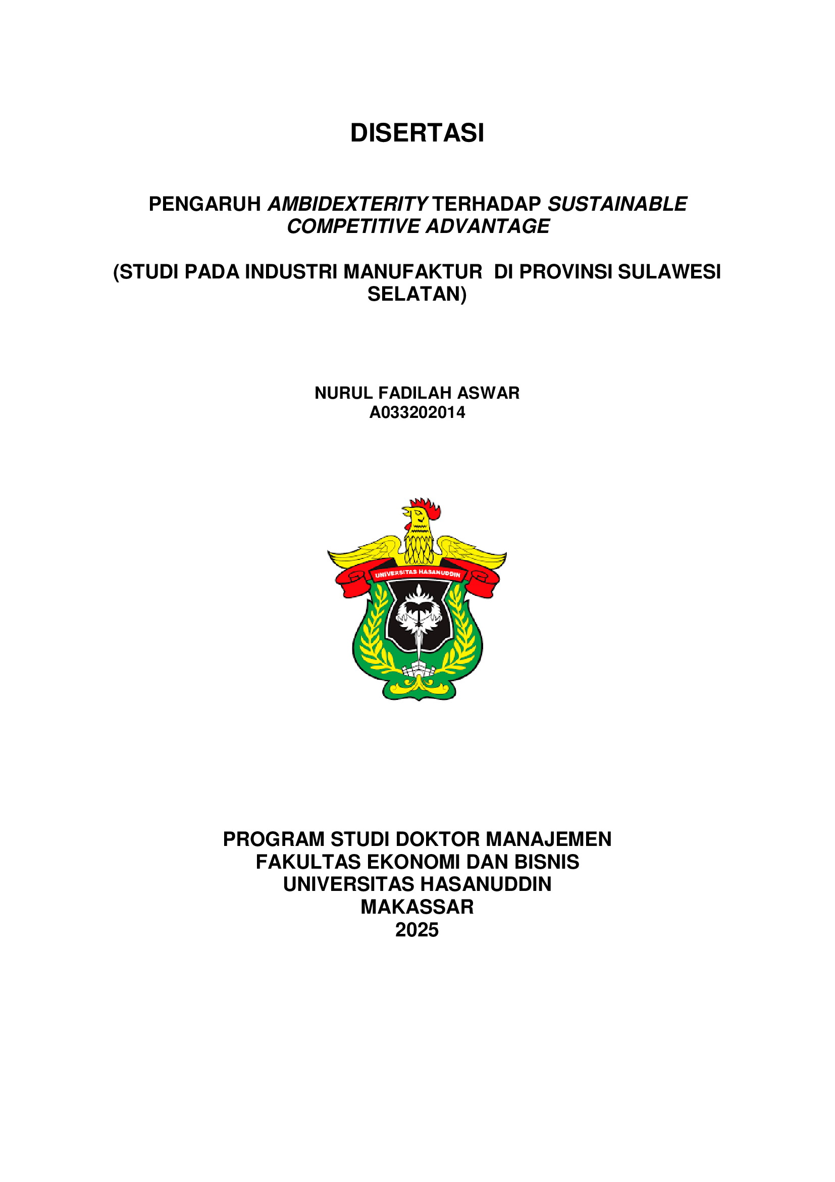 ASWAR, NURUL FADILAH (2025) PENGARUH AMBIDEXTERITY TERHADAP SUSTAINABLE COMPETITIVE ADVANTAGE (STUDI PADA INDUSTRI MANUFAKTUR DI PROVINSI SULAWESI SELATAN) = THE INFLUENCE OF AMBIDEXTERITY ON SUSTAINABLE COMPETITIVE ADVANTAGE (A STUDY ON MANUFACTURING INDUSTRY IN SOUTH SULAWESI PROVINCE). Disertasi thesis, Universitas Hasanuddin.