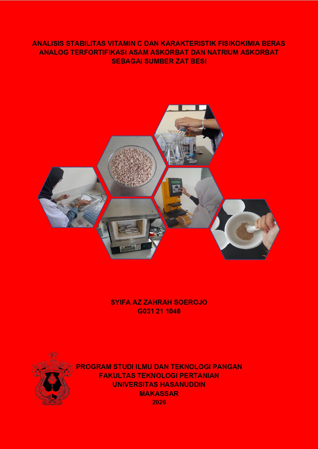 SOEROJO, SYIFA AZ ZAHRAH (2026) Analisis Stabilitas Vitamin C dan Karakteristik Fisikokimia Beras Analog Terfortifikasi Asam Askorbat dan Natrium Askorbat Sebagai Sumber Zat Besi = Analysis of Vitamin C Stability and Physicochemical Properties of Analog Rice Fortified With Ascorbid Acid and Sodium Ascorbate As An Iron Source. Skripsi thesis, Universitas Hasanuddin.