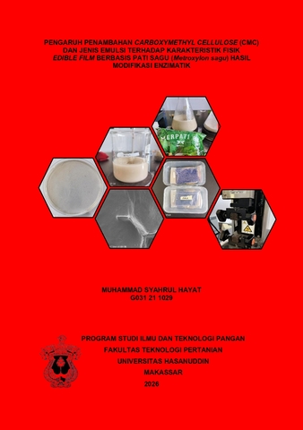 HAYAT, MUHAMMAD SYAHRUL (2026) PENGARUH PENAMBAHAN CARBOXYMETHYL CELLULOSE (CMC) DAN JENIS EMULSI TERHADAP KARAKTERISTIK FISIK EDIBLE FILM BERBASIS PATI SAGU (Metroxylon sagu) HASIL MODIFIKASI ENZIMATIK = THE EFFECT OF CARBOXYMETHYL CELLULOSE (CMC) ADDITION AND TYPE OF EMULSION ON THE PHYSICAL PROPERTIES OF ENZYMATICALLY MODIFIED SAGO-STARCH (Metroxylon sagu) EDIBLE FILMS. Skripsi thesis, Universitas Hasanuddin.