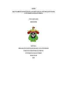 NUR AMINAH D, Akuntabilitas Pengelolaan Keuangan (Studi Kasus Pada Universitas Hasanuddin)” dibimbing oleh Prof. Dr. Maat Pono, SE.,,M.Si sebagai Pembimbing Utama dan Dr. Syarifuddin Rasyid, SE.,AK.,M.Si Pembimbing Pendamping. Akuntabilitas keuangan merupakan aspek fundamental bagi Universitas Hasanuddin (Unhas) dalam mewujudkan tata kelola perguruan tinggi yang transparan dan kredibel. Sebagai PTN-BH, Unhas dituntut mengelola anggaran secara efisien dan sesuai prinsip value for money, meskipun implementasinya masih menghadapi kendala teknis dan birokratis. Oleh karena itu, penguatan akuntabilitas menjadi strategi penting untuk menjamin keberlanjutan pendidikan, penelitian, dan pengabdian masyarakat. Penelitian ini bertujuan untuk menganalisis akuntabilitas pengelolaan keuangan di Universitas Hasanuddin yaitu kepatuhan terhadap regulasi, pengawasan internal dan eksternal, serta efisiensi penggunaan anggaran dan pelaporan keuangan yang akurat. Penelitian ini menggunakan pendekatan kualitatif dengan metode studi kasus deskriptif. Data diperoleh melalui observasi, wawancara mendalam, dan studi dokumentasi dari informan kunci yang mencakup direktur keuangan, satuan pengawas internal, serta staf administrasi keuangan. Hasil penelitian menunjukkan bahwa akuntabilitas pengelolaan keuangan di Universitas Hasanuddin melalui tiga aspek utama yaitu (1) kepatuhan terhadap regulasi, Universitas Hasanuddin telah mematuhi regulasi yang berlaku seperti Undang-Undang Nomor 12 Tahun 2012 dan Peraturan Pemerintah Nomor 26 Tahun 2015, (2) pengawasan internal dan eksternal, Pengawasan internal melalui Satuan Pengawas Internal (SPI) dan pengawasan eksternal oleh auditor independen telah dilaksanakan untuk mendukung transparansi dan akuntabilitas, (3) pelaporan keuangan yang akurat, Sistem informasi keuangan berbasis teknologi (SIMKEU) telah diterapkan di Universitas Hasanuddin untuk meningkatkan akurasi pelaporan keuangan