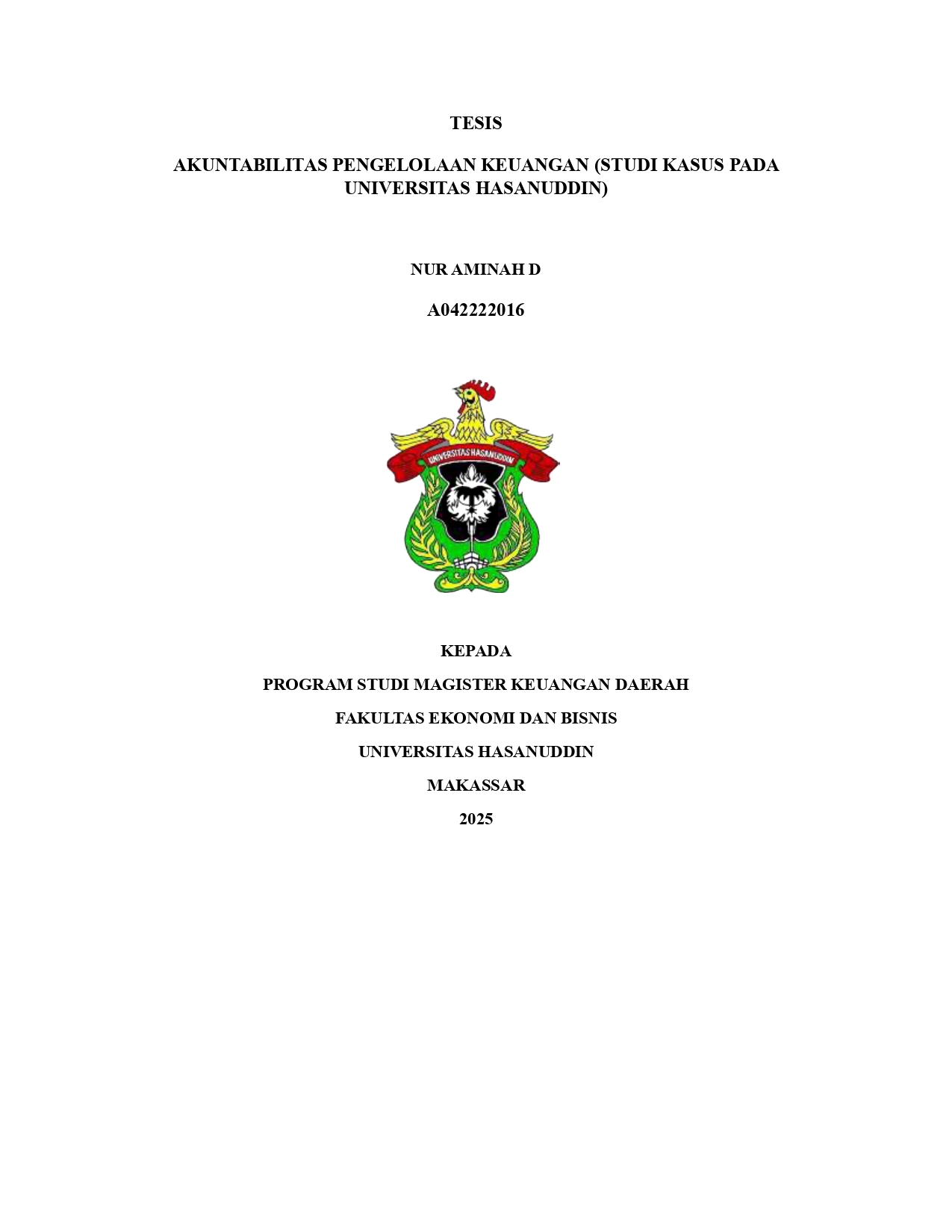 D, NUR AMINAH (2025) Akuntabilitas Pengelolaan Keuangan (Studi Kasus pada Universitas Hasanuddin) = Financial Management Accountability (A Case Study at Hasanuddin University). Thesis thesis, Universitas Hasanuddin.