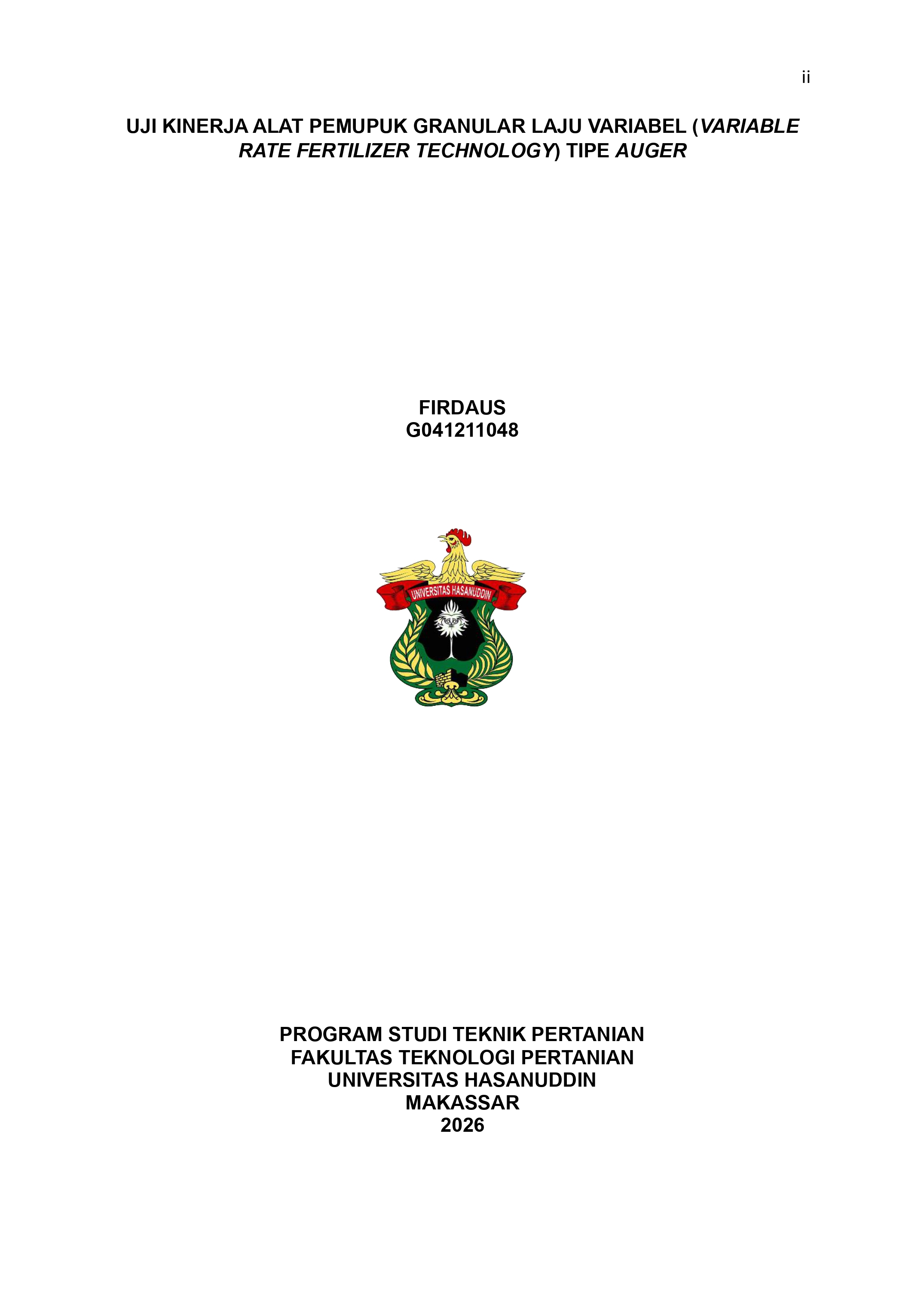 FIRDAUS, FIRDAUS (2025) Uji Kinerja Alat Pemupuk Granular Laju Variabel (Variable Rate Fertilizer Technology) Tipe Auger = Performance Test of Variable Rate Fertilizer Technology Auger Type. Skripsi thesis, Universitas Hasanuddin.